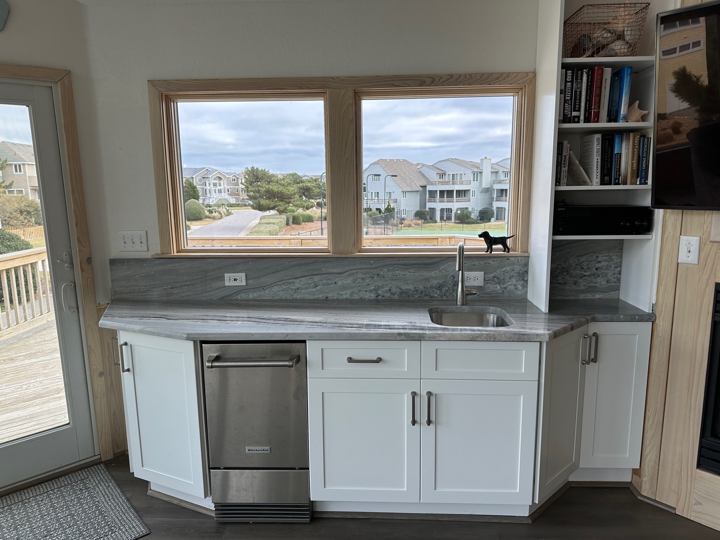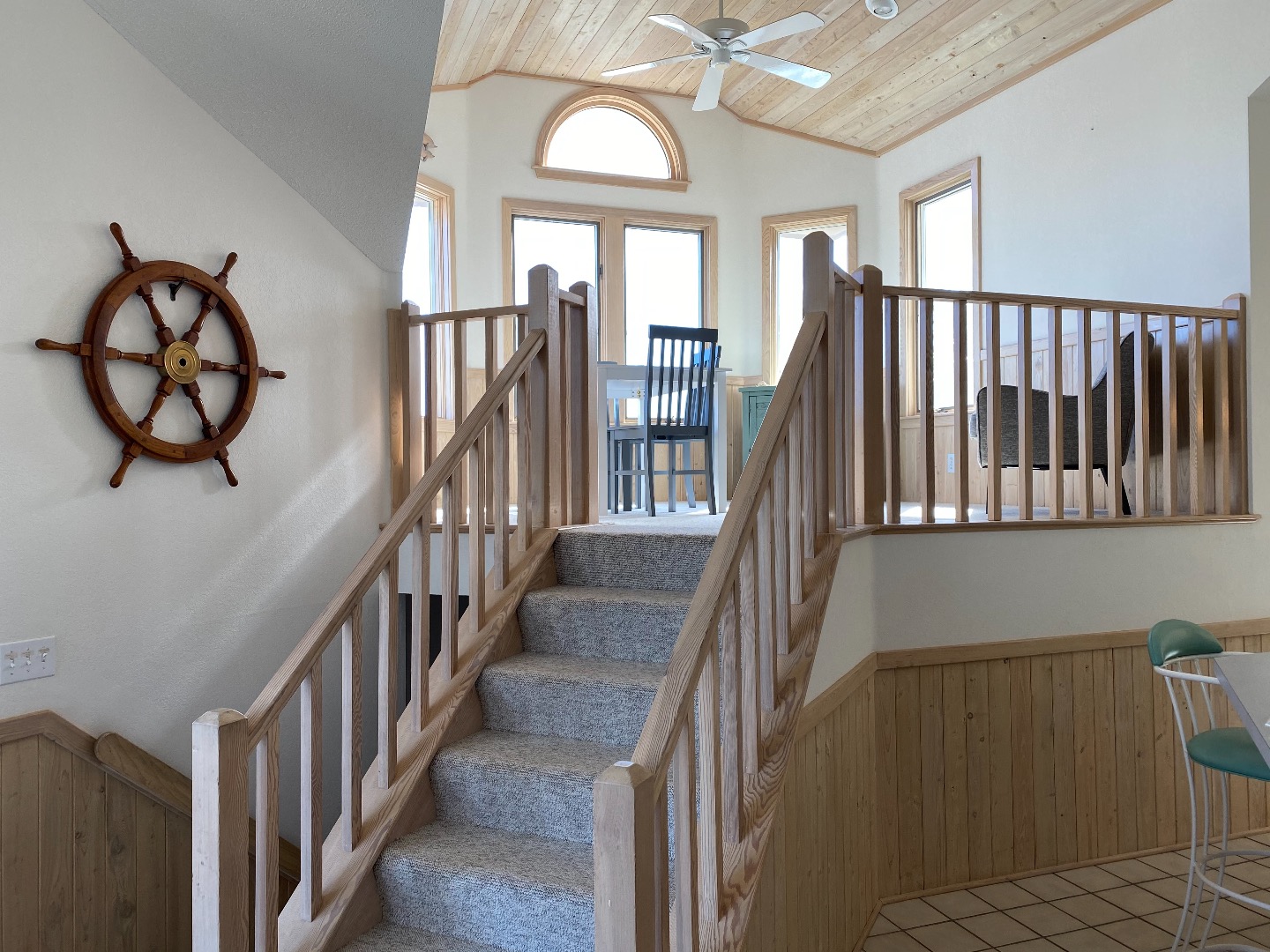 Top Level: Updated, large great room with 60” TV/DVD w/ Roku and lots of natural light, new windows and furniture, captain’s watch loft, dining room, kitchen with countertop seating, wet bar, half bath, King Master bedroom with master bath, large deck with lounge chairs and outdoor sound system and another deck off the dining room.