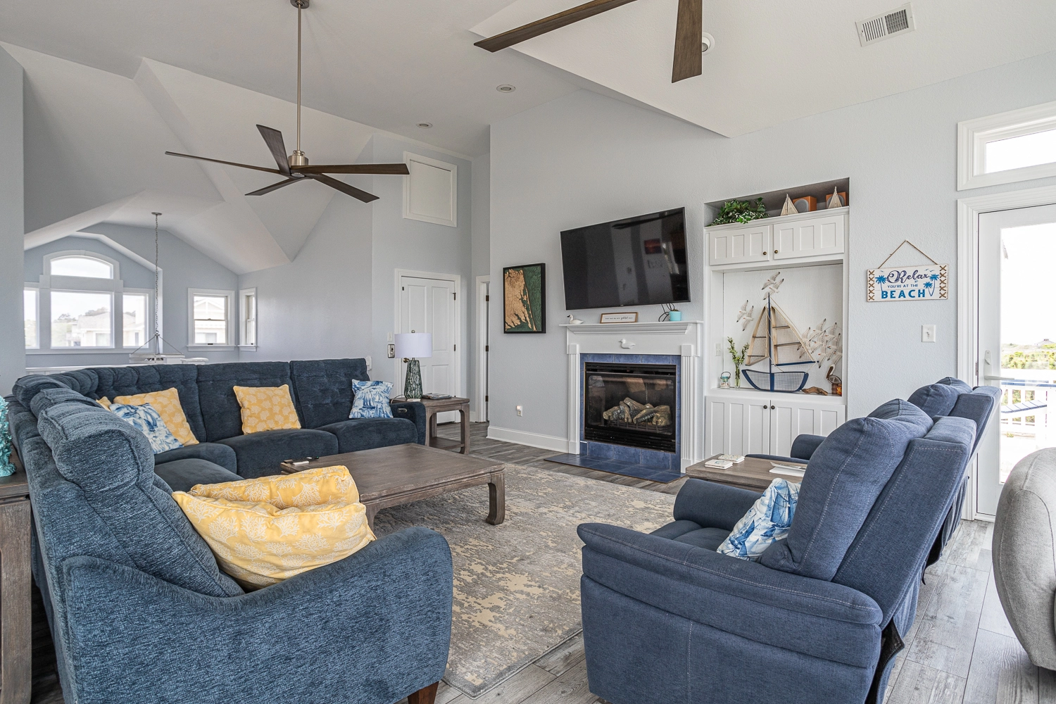 On the home's top floor, you’ll find the great room, which offers expansive ocean views. Relax in the comfortably furnished living area, which includes a gas fireplace for use during the cooler months of the year. The sunroom is a great place to curl up with a good book or to put together a puzzle during your stay. There is an elevator for easy unloading of luggage and groceries. The kitchen is equipped with all that you need to prepare meals throughout your stay. Two dishwashers are a huge help when it’s time to clean up. Gather together in the dining area to enjoy meals as a family. In the early morning, make your coffee and head outside onto the oceanfront deck to watch a beautiful Outer Banks sunrise over the ocean. Back inside, there is one master bedroom on the third level, which includes a gas fireplace, access to the deck, and a private bathroom with a whirlpool tub. There is also a half bathroom on the top level of the home.
