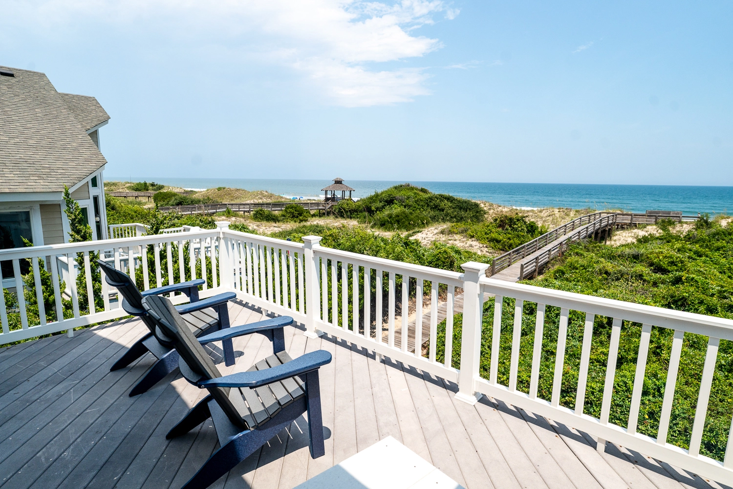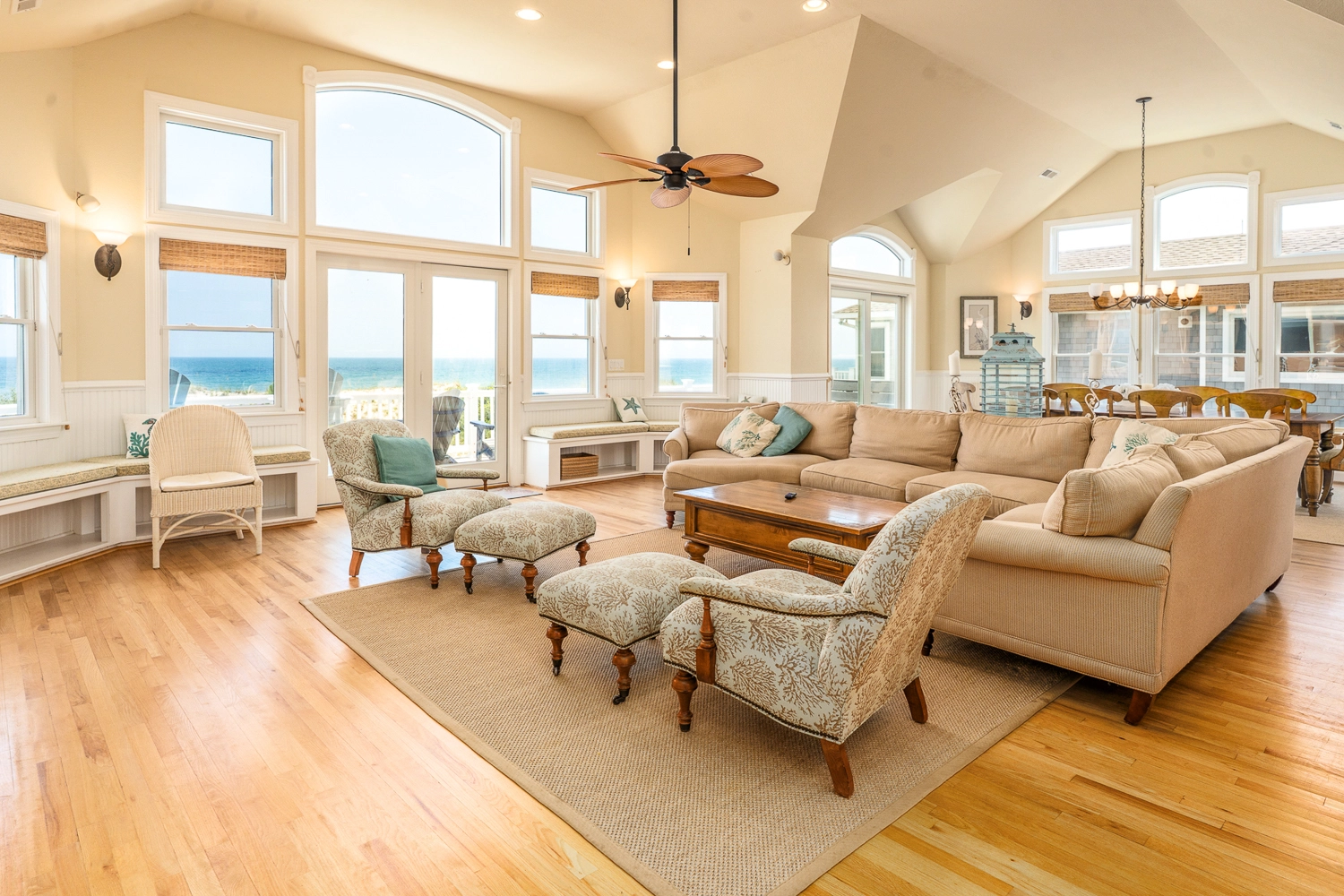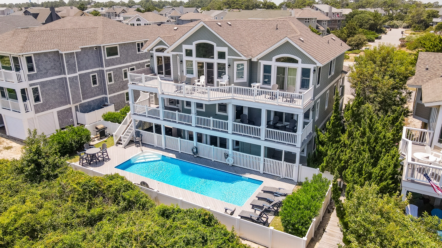 This oceanfront home offers views of the ocean and Currituck Lighthouse. Decorated with hardwood floors, this handicap-friendly home has a private pool with a shallow end for new swimmers, a hot tub and easy beach access. It's also situated close to the community amenities and trolley stop.