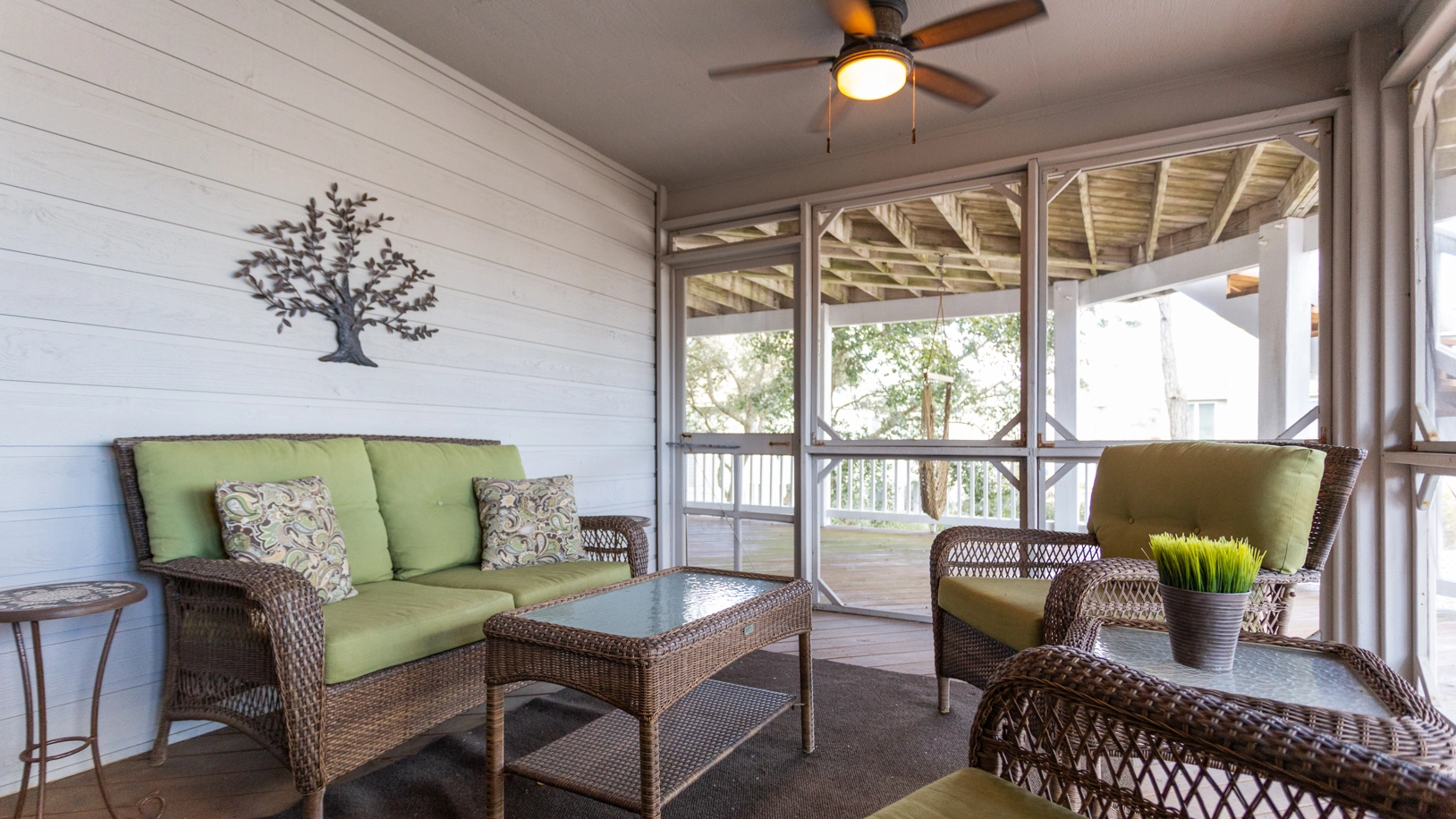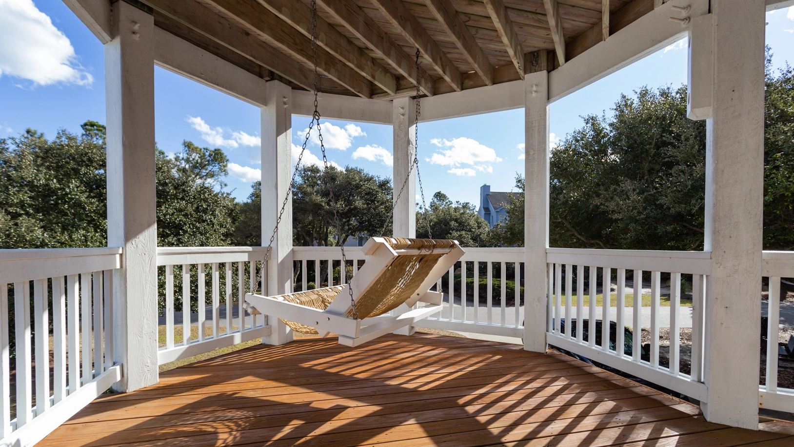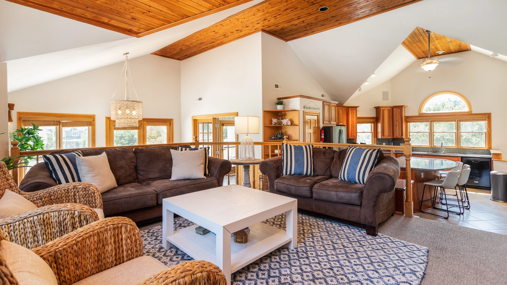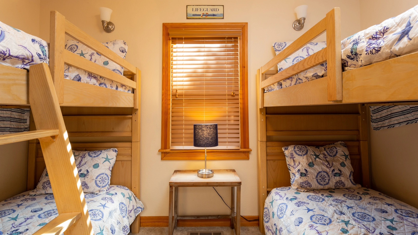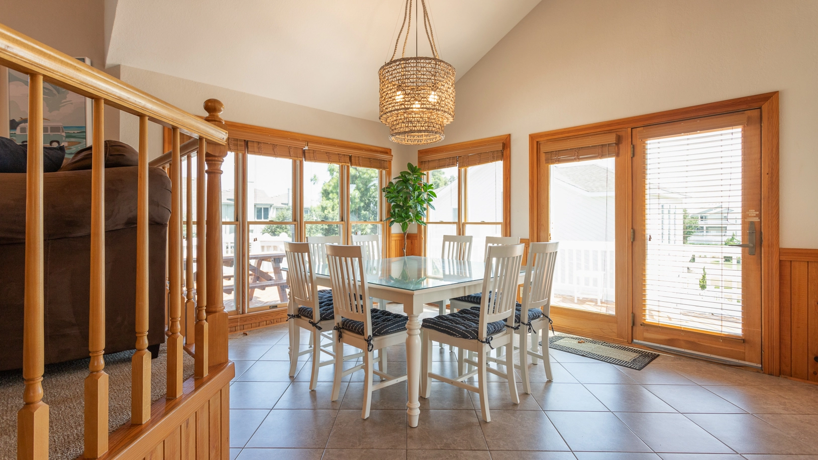 Featuring charming coastal decor, “Casa Delfino” is a cozy place to relax and unwind between activities. The great room on the top floor is attractive and offers a place for all staying in the home to congregate. The kitchen has plenty of counter space, including countertop seating, and is equipped to prepare meals for the duration of your stay. Eat together at the table nearby in the dining area, or choose to dine outdoors on the deck. Comfortable seating in the elevated living area allows everyone to gather and watch a movie together. A sunroom serves as an additional common space, perfect for playing a hand of cards or relaxing with a good book. Outside, the top level of the home includes both covered and uncovered decks. The covered deck is circular and has built-in seating, offering a great place to conversate over morning coffee. There is one master bedroom, with a private full bathroom, on the top level. A half bathroom can be found on the third level as well.