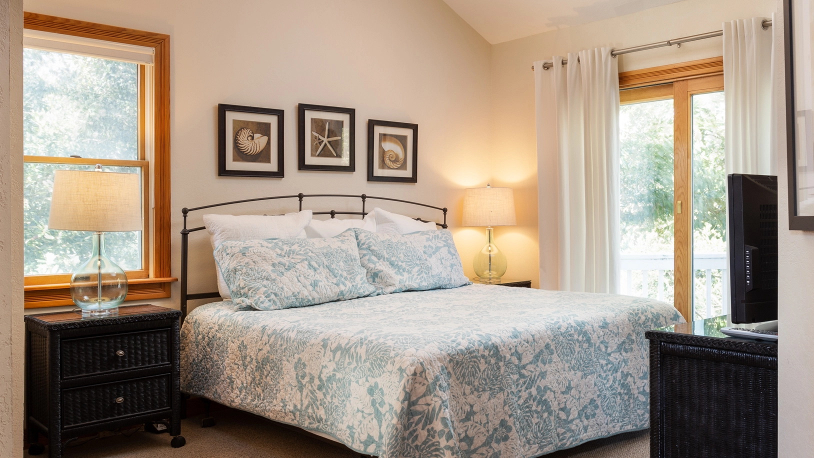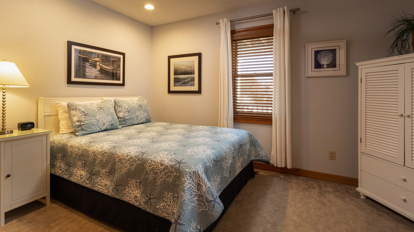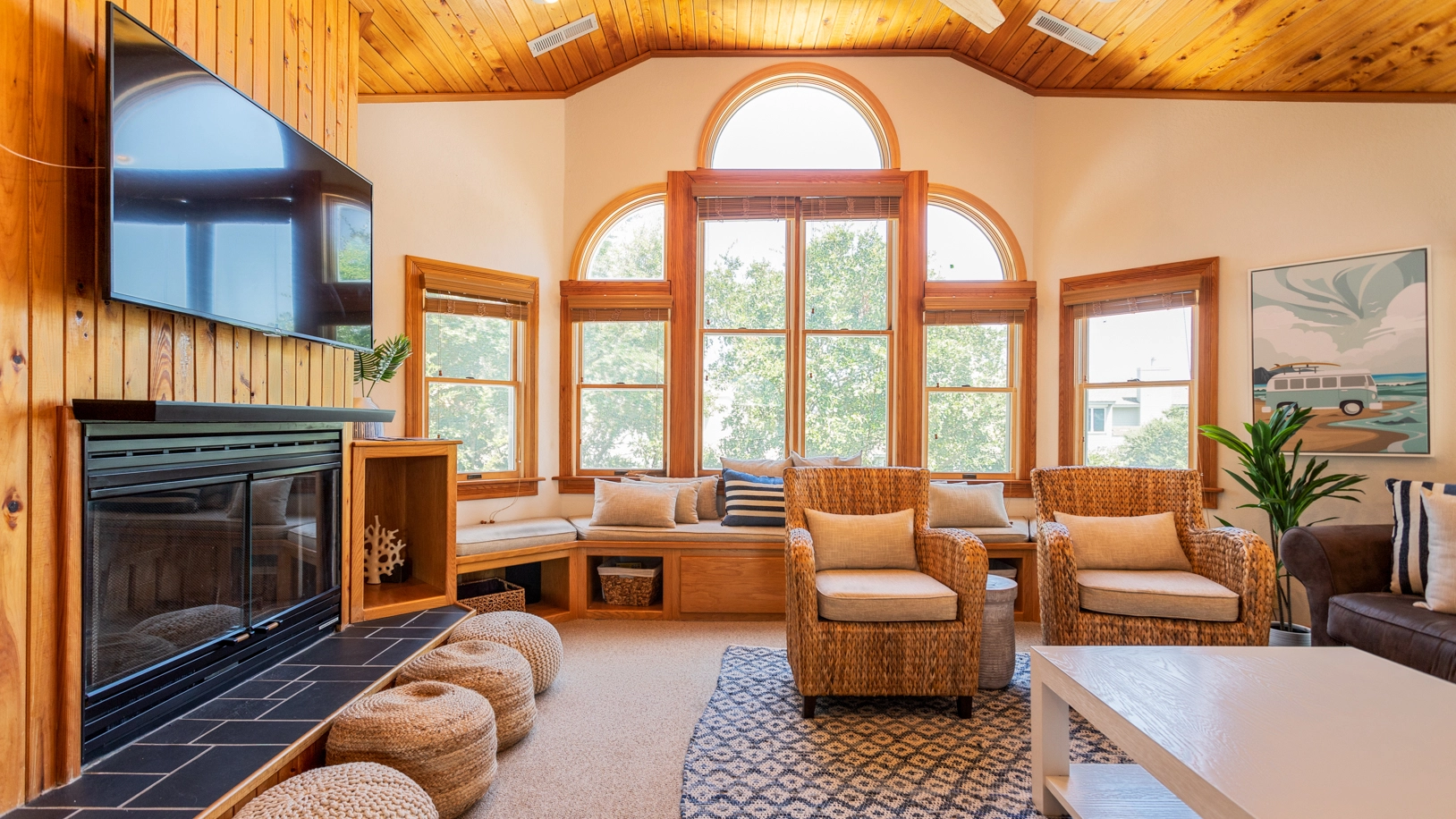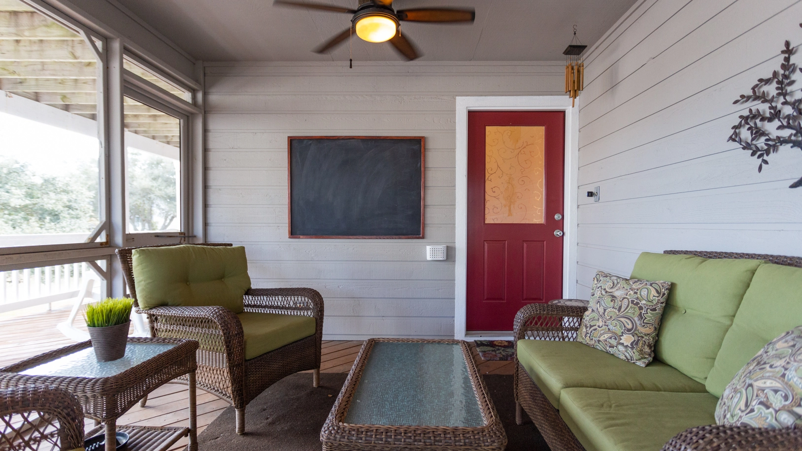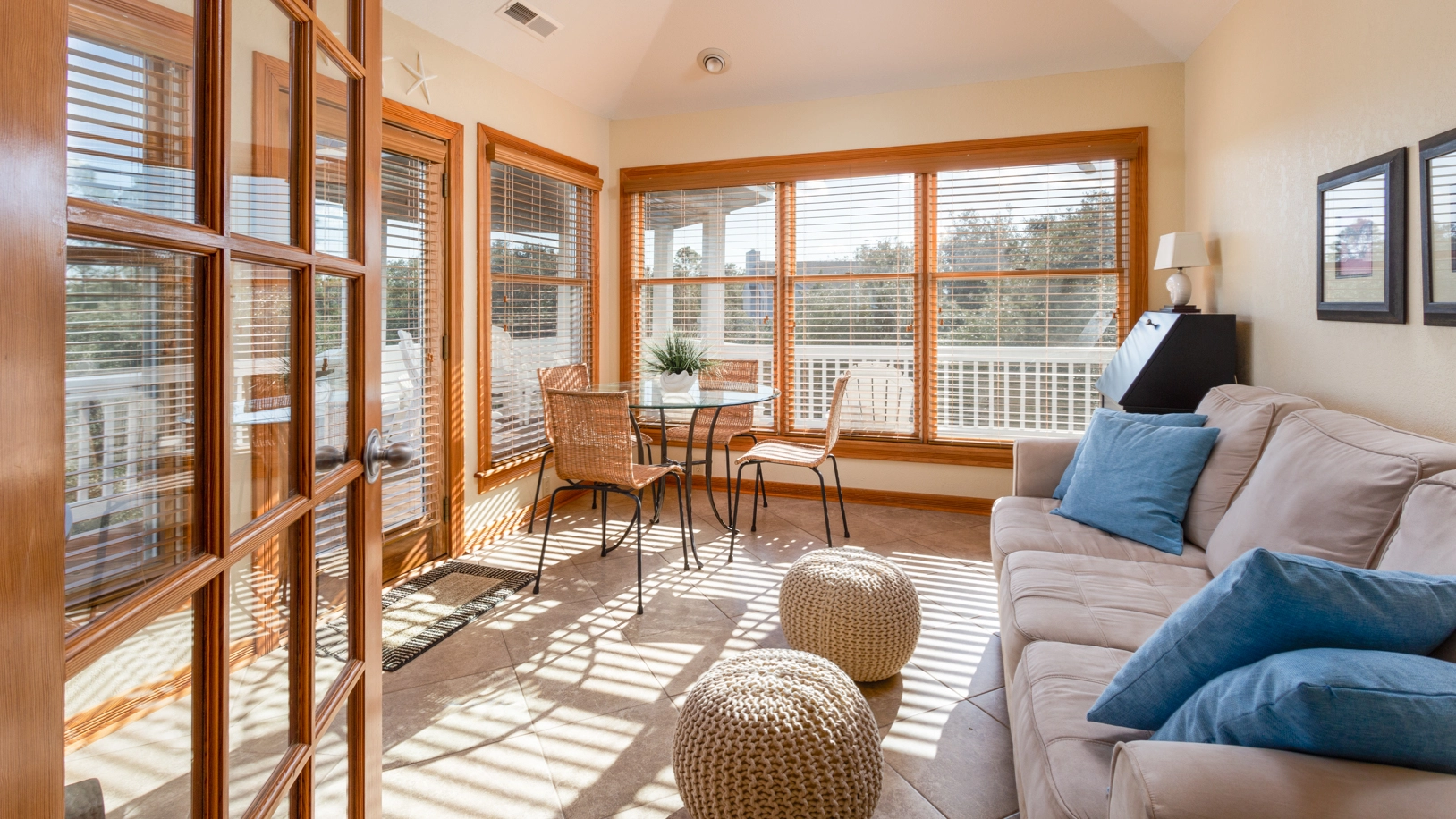 Featuring charming coastal decor, “Casa Delfino” is a cozy place to relax and unwind between activities. The great room on the top floor is attractive and offers a place for all staying in the home to congregate. The kitchen has plenty of counter space, including countertop seating, and is equipped to prepare meals for the duration of your stay. Eat together at the table nearby in the dining area, or choose to dine outdoors on the deck. Comfortable seating in the elevated living area allows everyone to gather and watch a movie together. A sunroom serves as an additional common space, perfect for playing a hand of cards or relaxing with a good book. Outside, the top level of the home includes both covered and uncovered decks. The covered deck is circular and has built-in seating, offering a great place to conversate over morning coffee. There is one master bedroom, with a private full bathroom, on the top level. A half bathroom can be found on the third level as well.