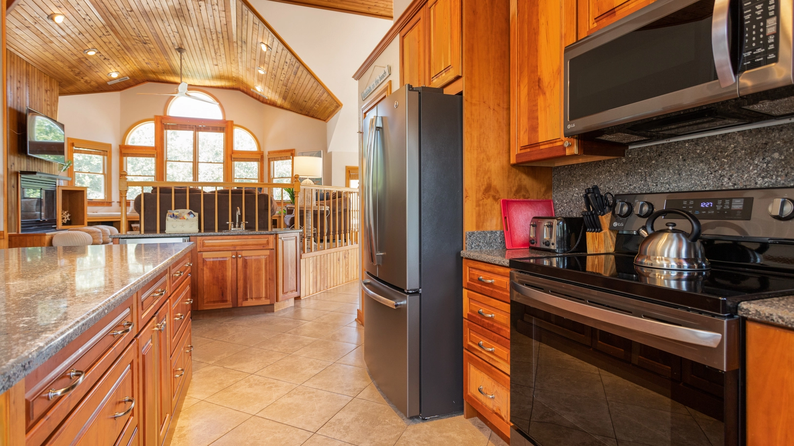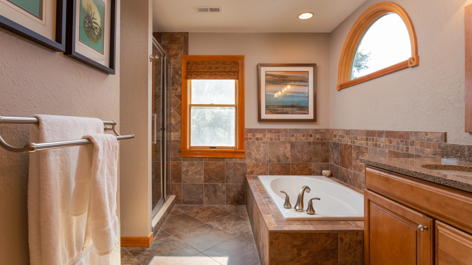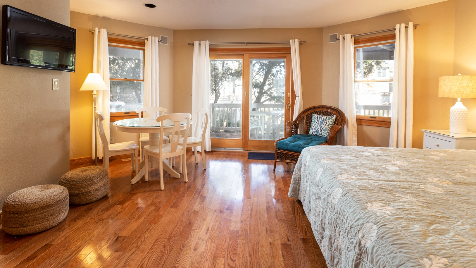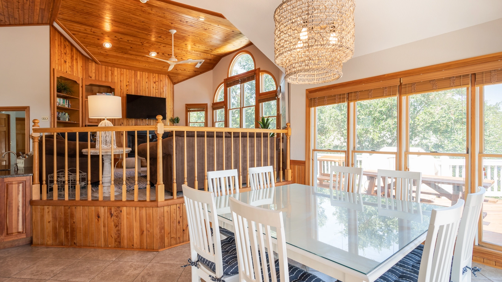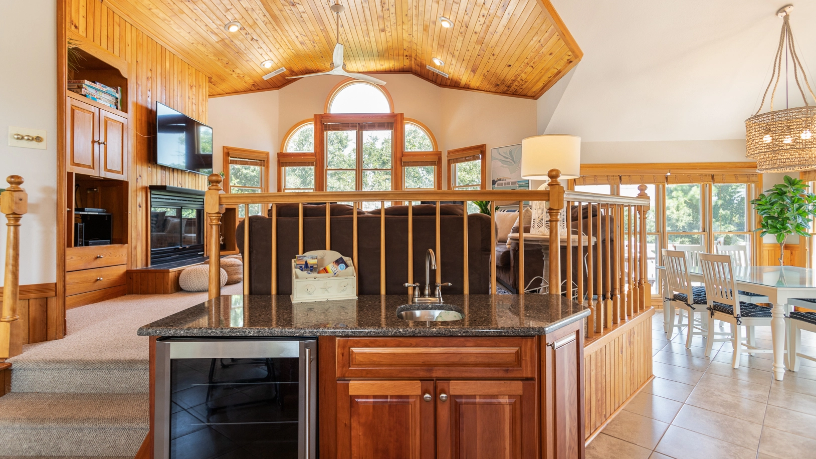 Featuring charming coastal decor, “Casa Delfino” is a cozy place to relax and unwind between activities. The great room on the top floor is attractive and offers a place for all staying in the home to congregate. The kitchen has plenty of counter space, including countertop seating, and is equipped to prepare meals for the duration of your stay. Eat together at the table nearby in the dining area, or choose to dine outdoors on the deck. Comfortable seating in the elevated living area allows everyone to gather and watch a movie together. A sunroom serves as an additional common space, perfect for playing a hand of cards or relaxing with a good book. Outside, the top level of the home includes both covered and uncovered decks. The covered deck is circular and has built-in seating, offering a great place to conversate over morning coffee. There is one master bedroom, with a private full bathroom, on the top level. A half bathroom can be found on the third level as well.