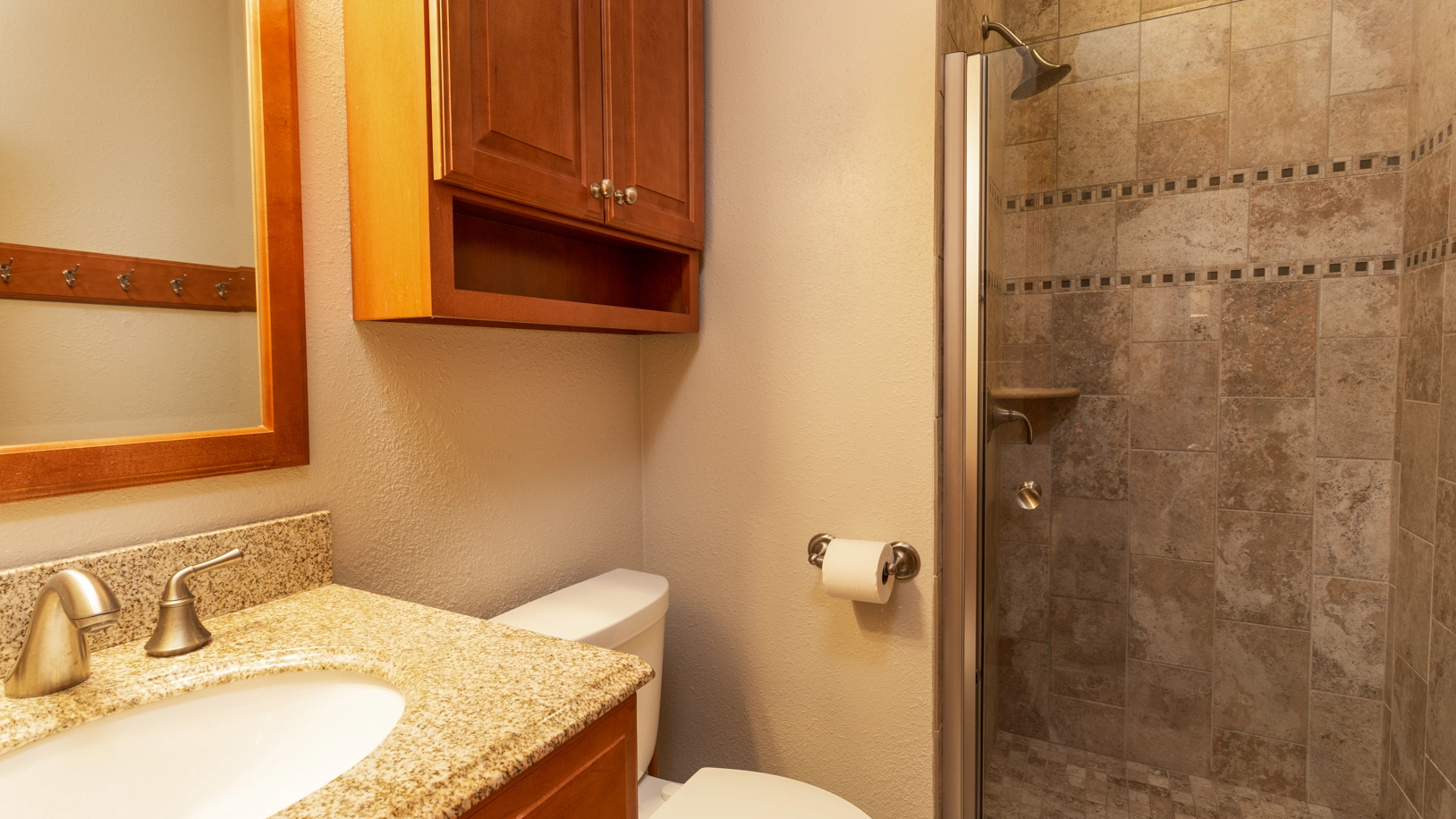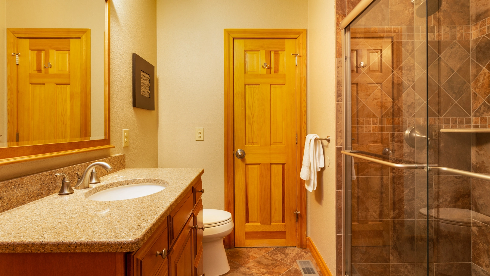 The middle level of the home consists of sleeping quarters. There are four bedrooms and two full bathrooms on the second floor. The screened porch and porch swing are comfortable features on the middle level deck. Laundry facilities and an additional sitting area can be found on the ground floor. The outdoor ping pong table will provide many hours of family fun.