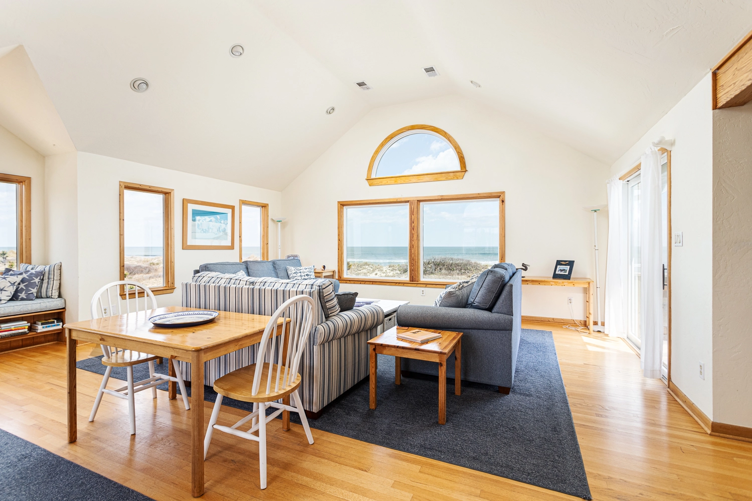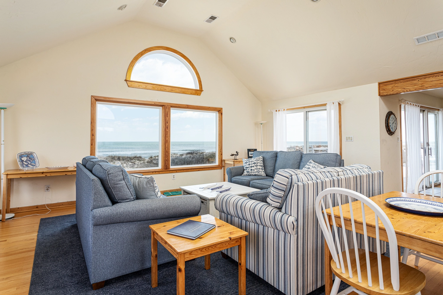 Enjoy a memorable family vacation in this beautiful Corolla Light beachfront home. Featuring unimpeded ocean views and easy beach access, "Cloud 9" provides comfortable and spacious living areas on three levels. The top level’s open floor plan provides panoramic ocean views, an open kitchen, an expansive dining area and plenty of space for the whole family to enjoy together. The ocean-side decks on two levels offer expansive space for sunbathing or enjoying a relaxing soak in the hot tub. Adjourn to the spacious master bedroom, complete with a large walk-in shower and deck access. A half bathroom completes this level.