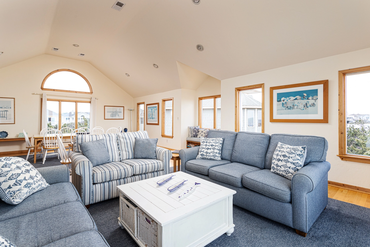 The second level of this home offers one master bedroom with a large walk-in shower and deck access, and two rooms that share a full bathroom. The family room is a wonderful space to enjoy with seating and a large screen TV.