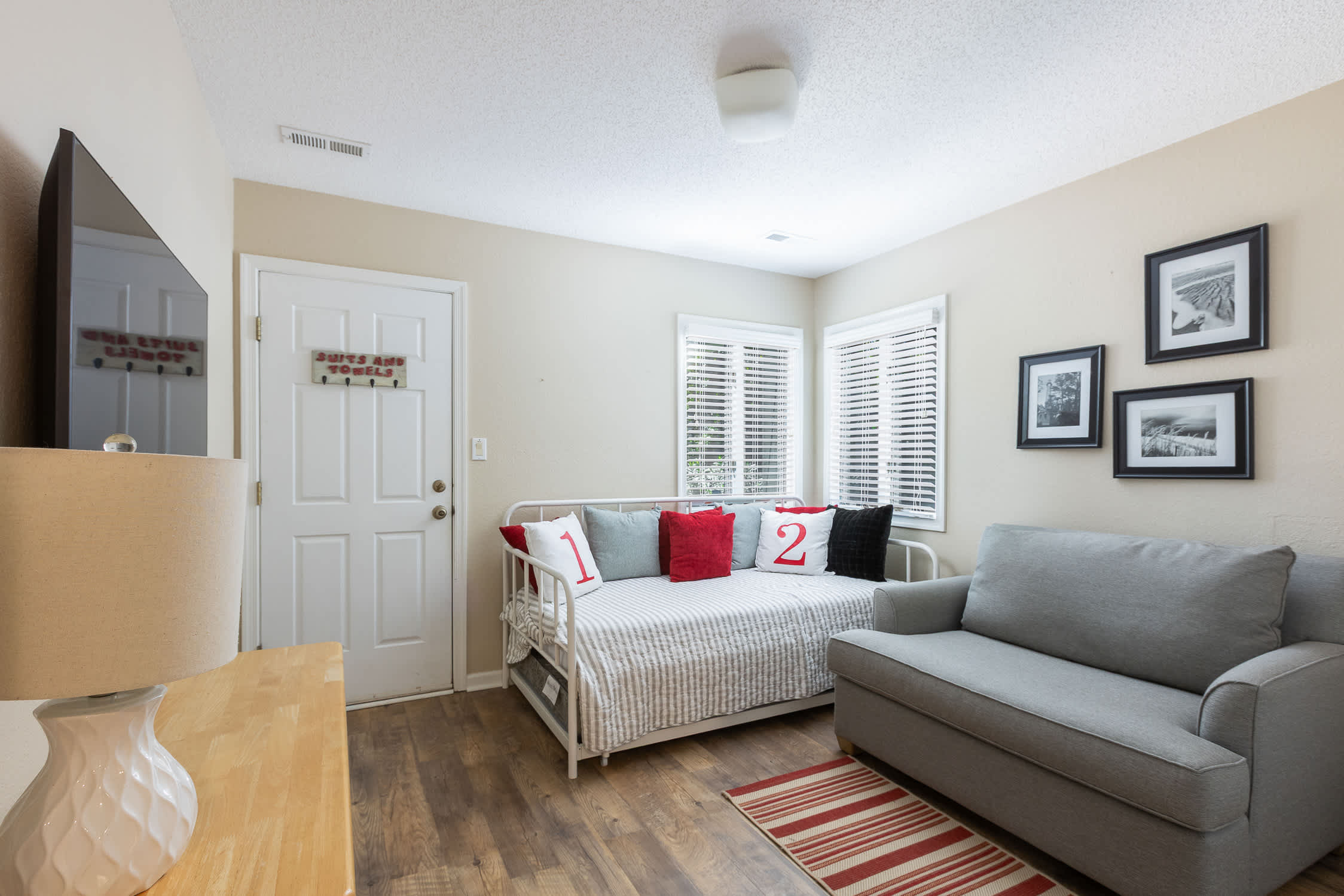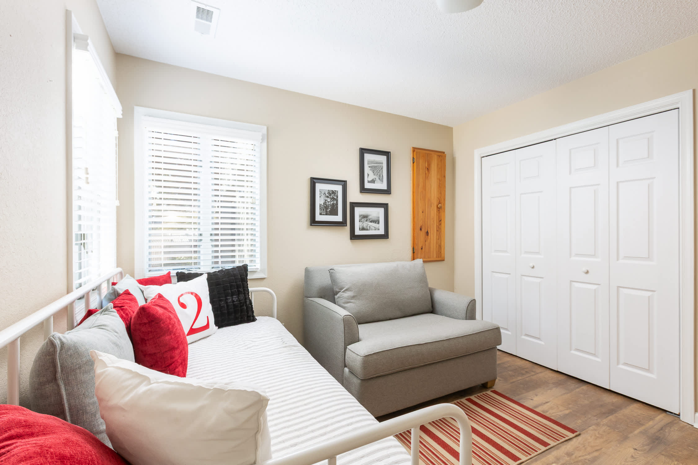 -Bedroom with a Day Bed, a Trundle and a Single Sleep Chair with a flat-screen TV and patio access.