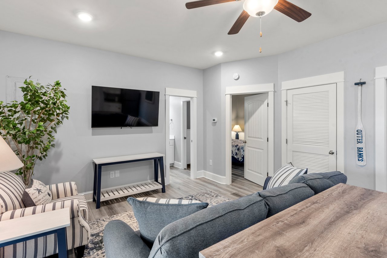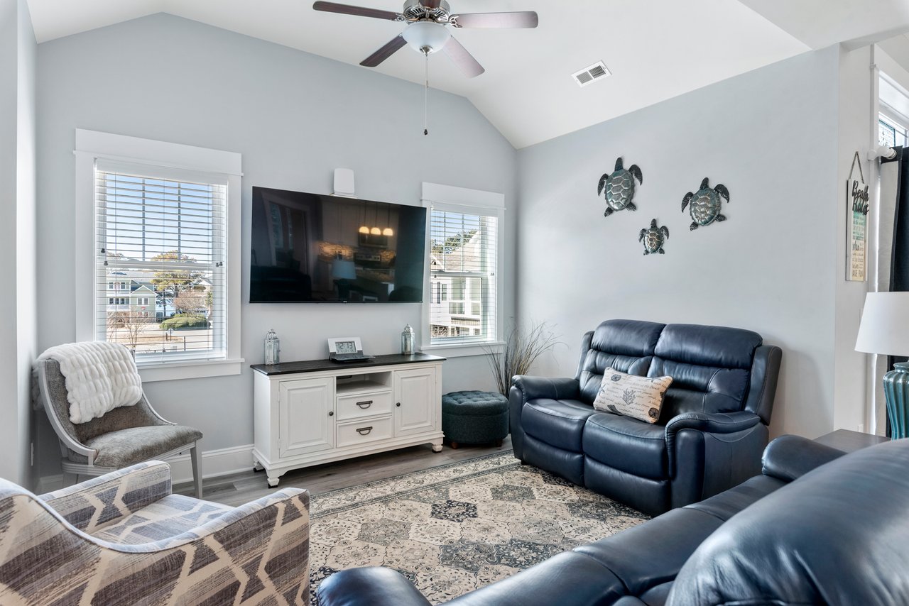 The main level has soaring vaulted ceilings in the open-concept layout. There are two master bedrooms each with glass shower ensuites: the queen has been designed to offer a small working desk and chair: the king boasts a new Serta I-Comfort Hybrid mattress. The great room offers another large 65” smart Roku TV, new leather reclining sofas, and additional seating for the whole family. The new dining area is designed to seat eight, with a bench that offers easy in and out seating. The well-equipped kitchen boasts stainless-steel appliances, granite counters, an island with barstools, huge pantry, and plenty of workspace. Enjoy the gorgeous sunsets on either of the two front decks outfitted with new Nags Head Polywood furniture.