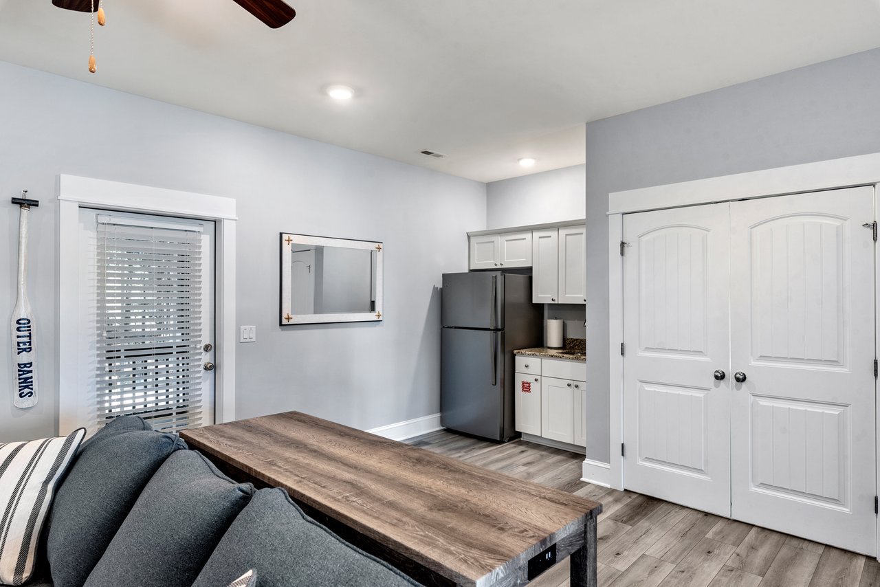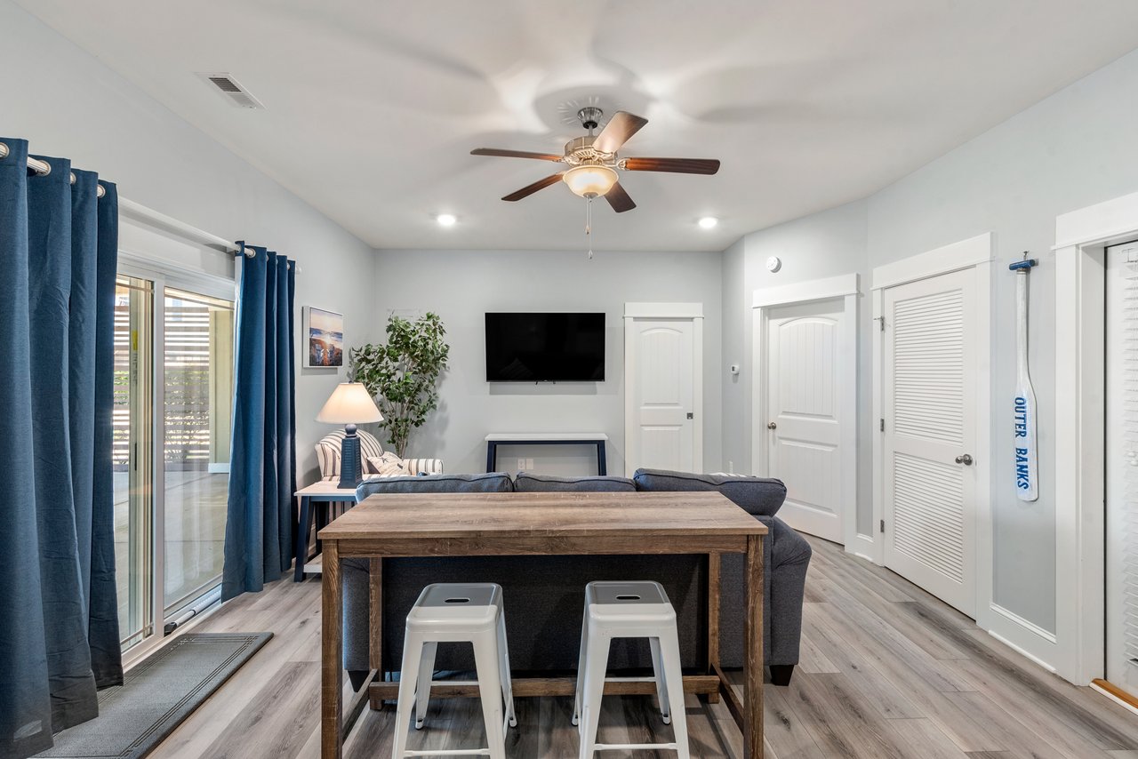 Sunset Villa is a newly renovated townhome in the oceanside community of Beacon Villas at Corolla Light. Designed for work-from home comfort, this lightly rented townhome is situated oceanside at the corner of Shad St, where you are approximately 750 steps to toes in the sand! Enjoy the best of both worlds: gorgeous sunset views of the Currituck Sound from the upstairs front decks and ocean sounds from the downstairs private fenced in back patio!