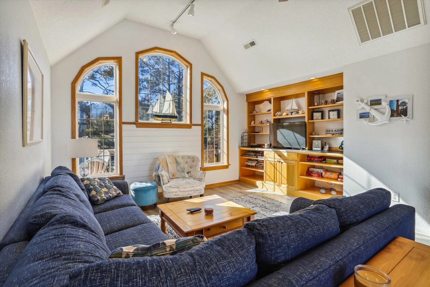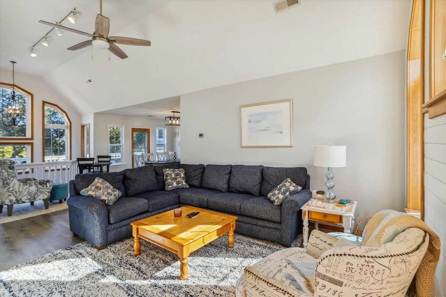 On the top floor of the home, the great room features nautical decor and is the perfect place to relax before or after spending your day outside. The living area is cozy and features a SmartTV. The vaulted ceiling and plethora of windows allow natural light to fill the space. The kitchen is fully stocked with all equipment needed to prepare meals for the duration of your stay. Dining options include the table nearby, breakfast peninsula at the kitchen counter, or outside at the table on the deck. There is also a large patio table in the pool area. On the third floor, there is one master bedroom, which includes a private bathroom and access to the deck.