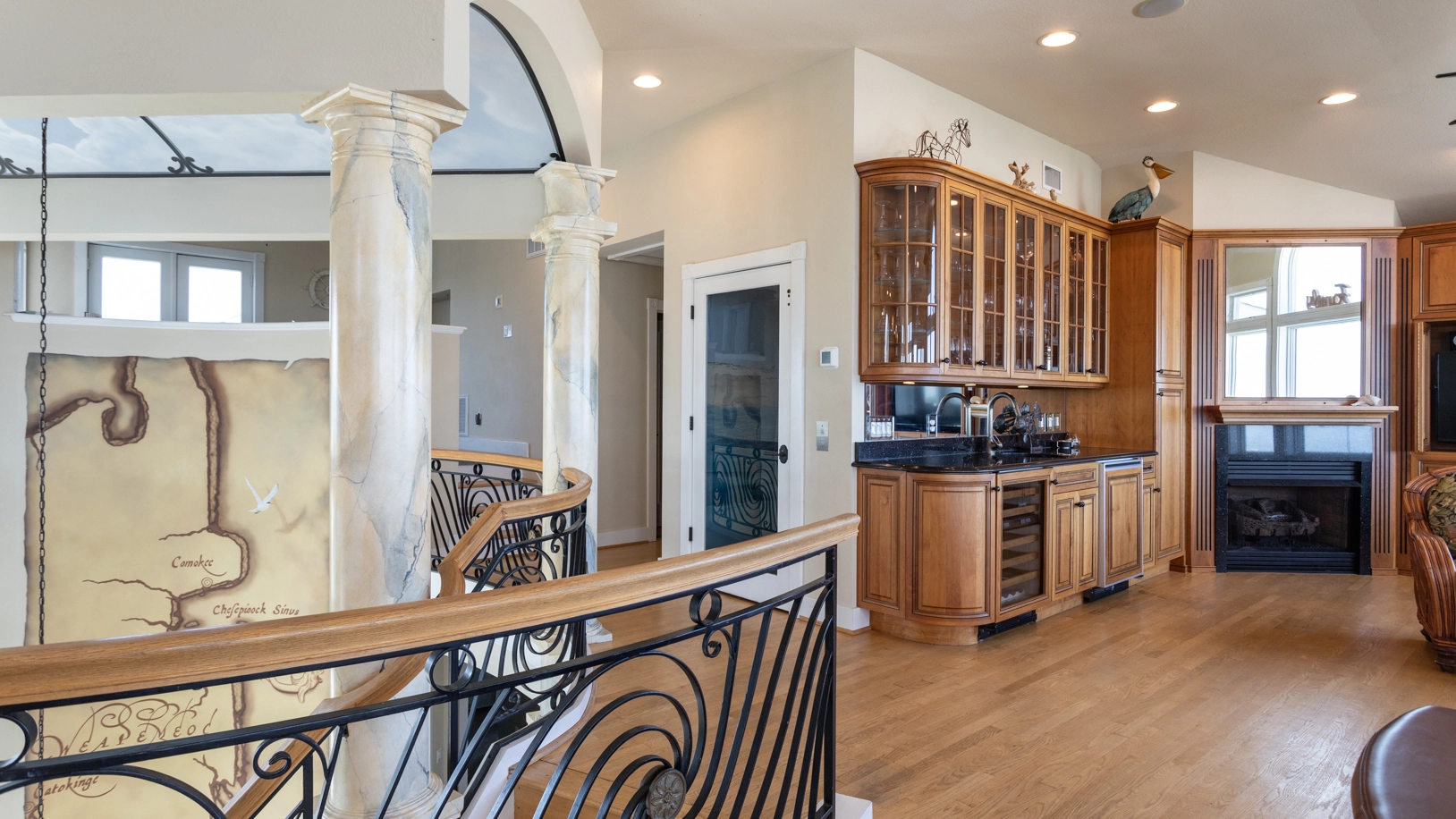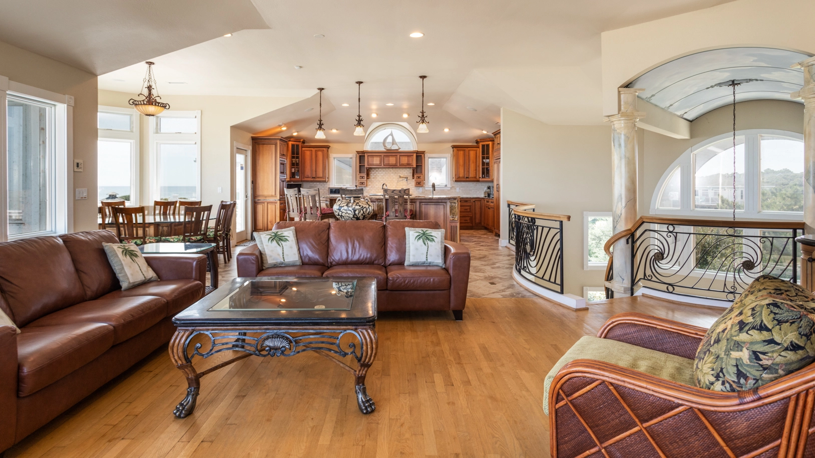 Family Dreams is an oceanfront home with views of the ocean and lighthouse that will take your breath away. As will the exquisite custom-handcrafted wrought-iron stair rail which wraps its way around a three-story foyer from the onyx inlaid compass rose to the Romeo and Juliet balcony beneath a one-of-a-kind barreled ceiling. Hand-painted murals, including a beautiful piece in the elevator, and custom cabinetry and furnishings give this home a truly luxurious feeling.
