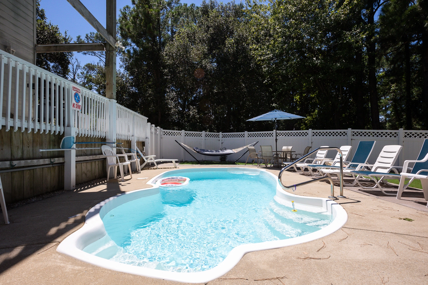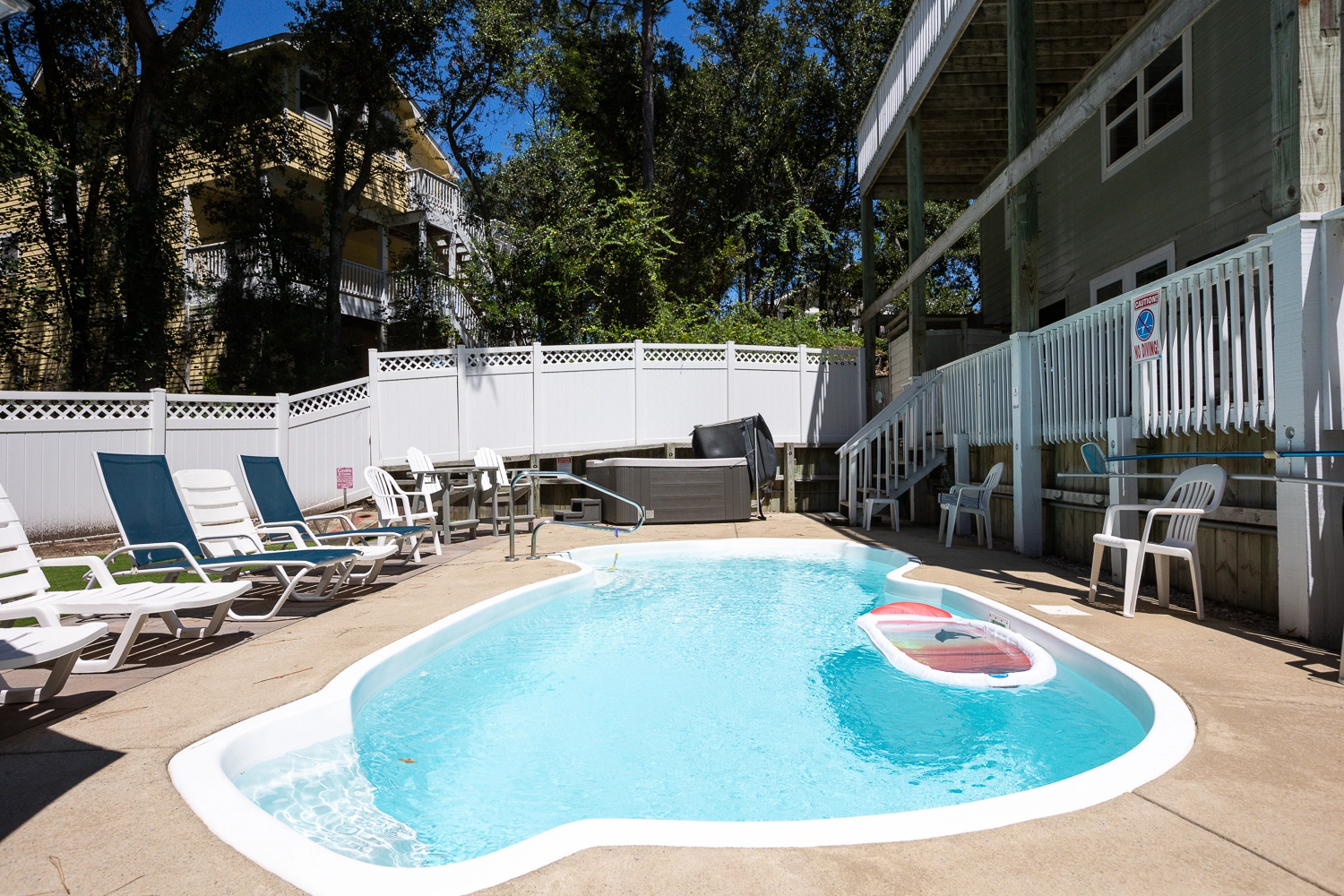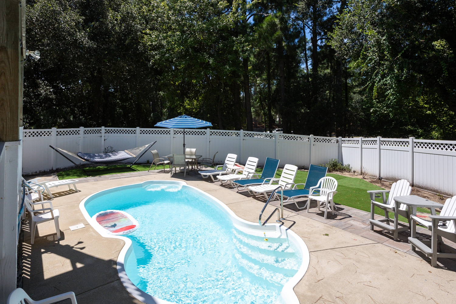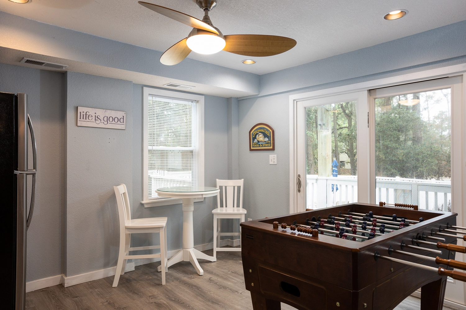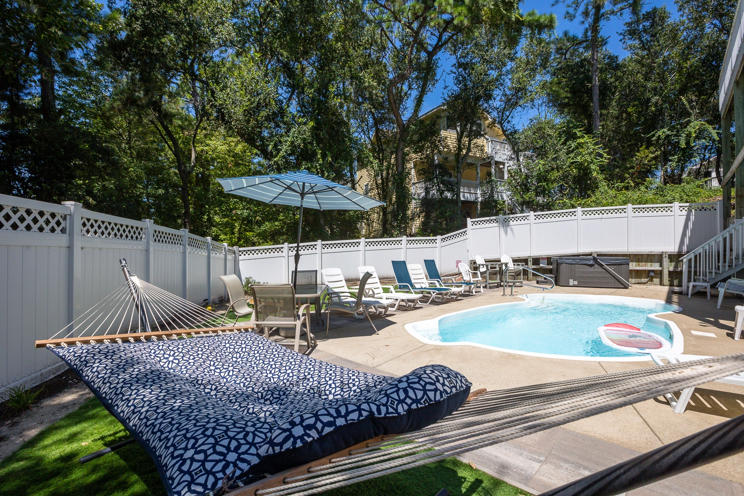 Step outside of the rec room door to the outdoor oasis. Make a splash in the private pool or enjoy a restorative soak in the hot tub. The beautifully landscaped pool area features a variety of seating options, including a table and chairs that is perfect for lunch by the pool. Grassy areas around the pool host a cornhole game and a hammock for going to the next level of relaxation. In addition to the amenities at the vacation home, Corolla Light offers a plethora of community amenities and activities. Trolley service throughout the community is available during the summer months, so no need to worry about finding parking at the oceanfront pool complex, soundfront pool, or fitness center with indoor pool. With the perfect mix of relaxation and amenities, “Fern Gully” is sure to leave our guests relaxed with treasured Outer Banks vacation memories!