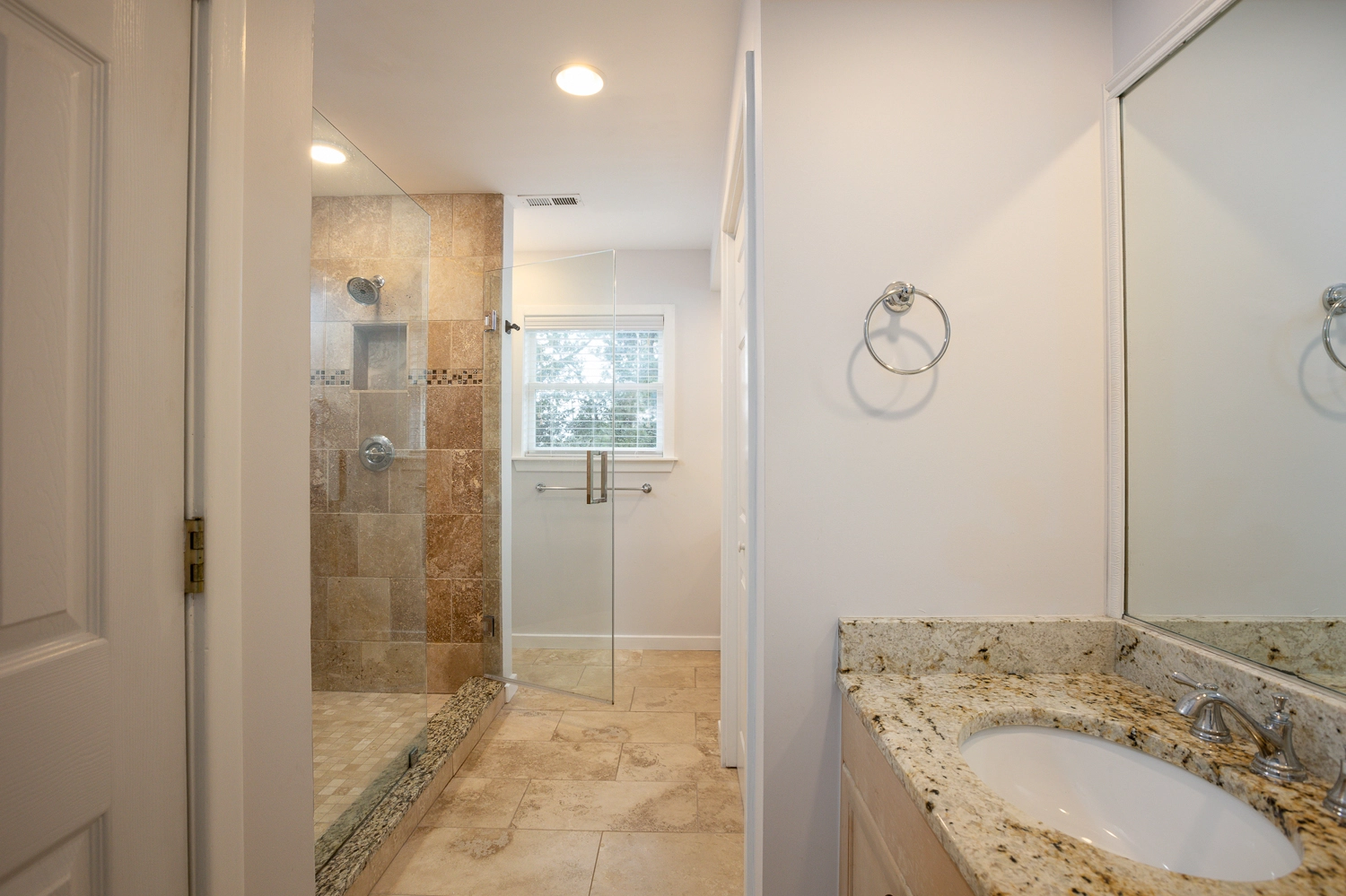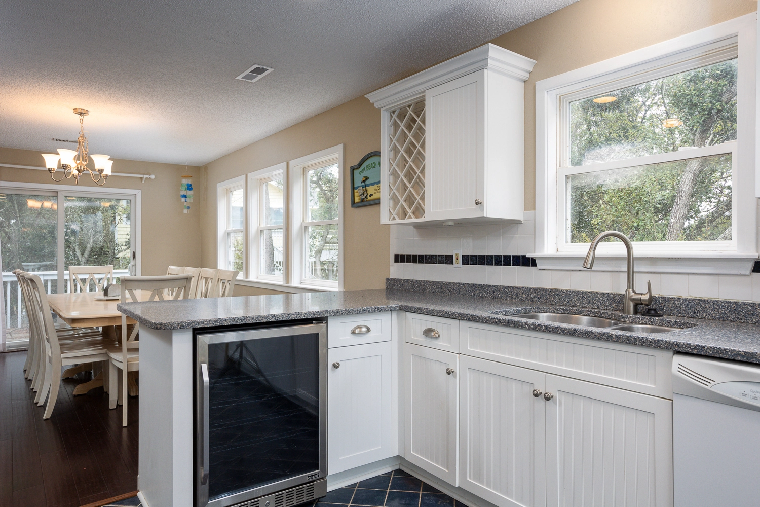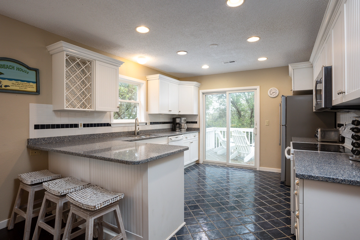 The main living space is on the top floor of the home, which features high ceilings and many windows that allow natural light to fill the great room. Kick back and relax with family and friends in the living area and enjoy your favorite TV show. A gas fireplace is available for use during cooler months. A separate sitting area nearby is the perfect place to catch up on email or curl up with a good book. The attractive kitchen is fully stocked with all equipment needed to prepare meals for the duration of your vacation including a wine fridge. Enjoy meals together inside in the dining area or outside on the deck. Step outside onto the back deck off of the living area and dining area to enjoy your morning coffee and listen to the birds chirp in the trees. There is one master bedroom on the third floor of the home, which includes a private full bathroom with dual vanities.