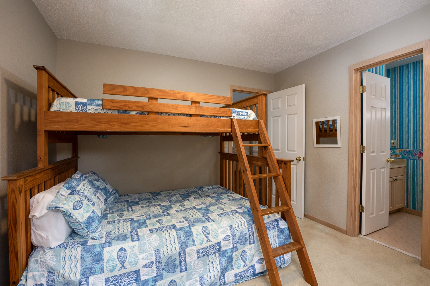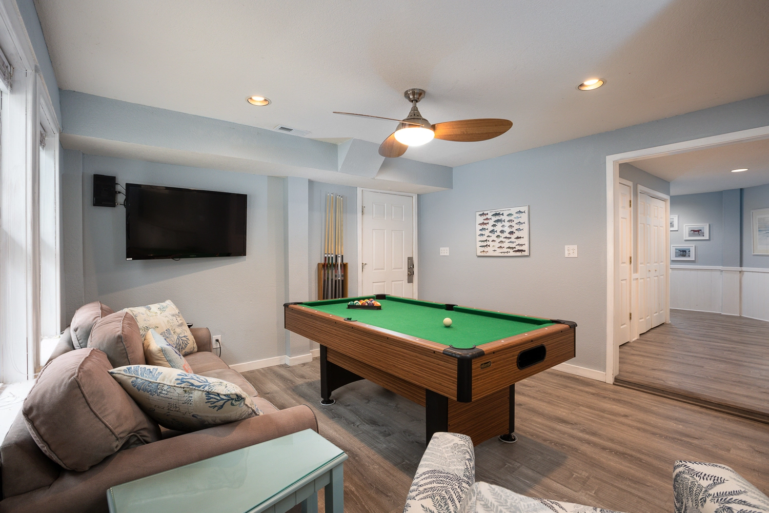 The middle level is a mixture of sleeping quarters and common space. There are four bedrooms, two full bathrooms and a powder room on this floor. There is also a den with a TV on the middle floor. There is one additional bedroom on the ground floor, with a semi-private full bathroom. The rec room on the ground floor features a pool table, foosball and dartboard, as well as a kitchenette with a full size refrigerator for easy snack and drink breaks.