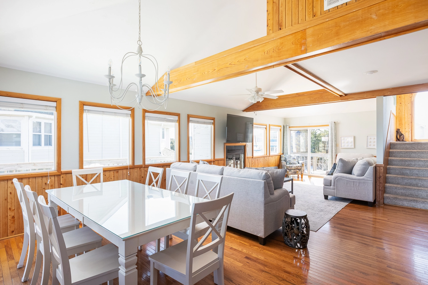 The home’s main gathering space is in the great room on the second floor. The living area is situated perfectly for catching up with loved ones or watching TV together. Across the room, the well-equipped kitchen is stocked with everything you need to prepare meals throughout your vacation. Meals can be enjoyed together at the dining area table nearby, which offers an ocean view. The coffee bar, adjacent to the kitchen, is a great place to grab a cup of coffee and head out to the deck. When you’re ready for some fresh air, step outside onto the deck to enjoy the salty breeze. Back inside and up just a few stairs, the ship’s watch is the perfect place to sip your morning coffee, with large windows to enhance the beautiful views of the ocean to the east and Currituck Beach Lighthouse to the west. Across the great room and up a half-flight of stairs, the ship’s watch is the perfect place to sneak away with a good book. This room offers windows on three sides with views of the ocean and the lighthouse. There is a TV and a wet bar with a beverage refrigerator, as well as built-in bench seating.