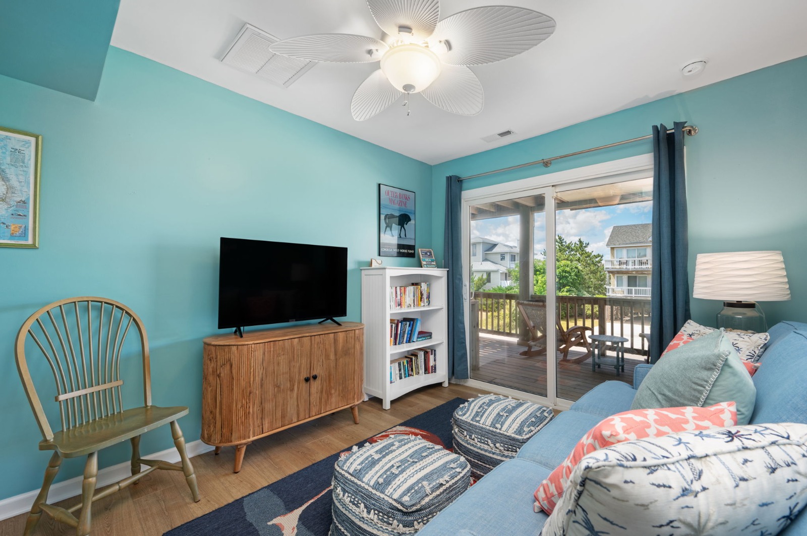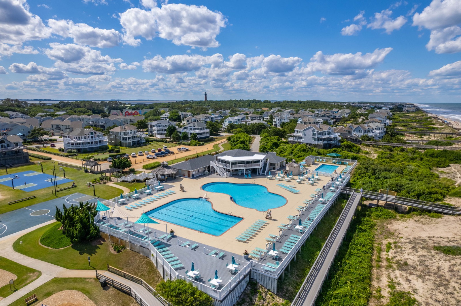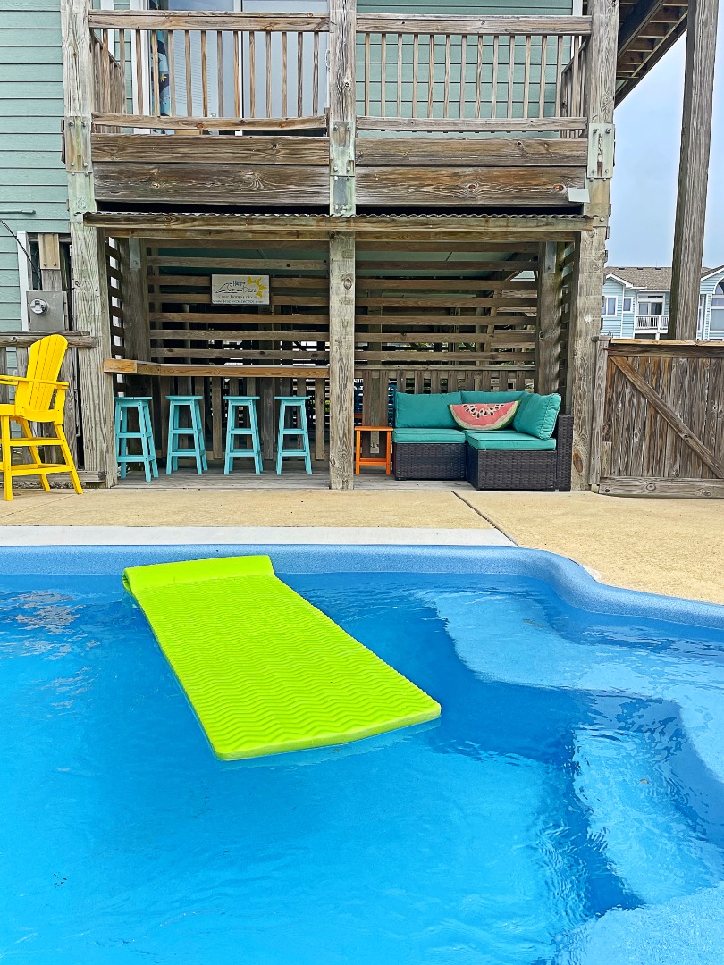 Extras - Private Pool (11×27) featuring a Covered Cabana with Tiki Bar and Sun Deck, Covered Hangout area with second Bar and Fridge/Freezer, Hot Tub (6), 5 flat-screen TVs, 2 smart Blu-Ray/DVD players, Bluetooth sound system, games, puzzles and book library, high-speed internet access, high chair, pack-n-play, outside shower, picnic table, bike rack, seasonal electric fireplace, park style charcoal grill with fish cleaning table, parking for 4+ vehicles, linens and towels provided, community water and Corolla Light Community Amenities for 12 guests (Corolla Light is a private community that requires guests to wear wristbands to access community amenities).