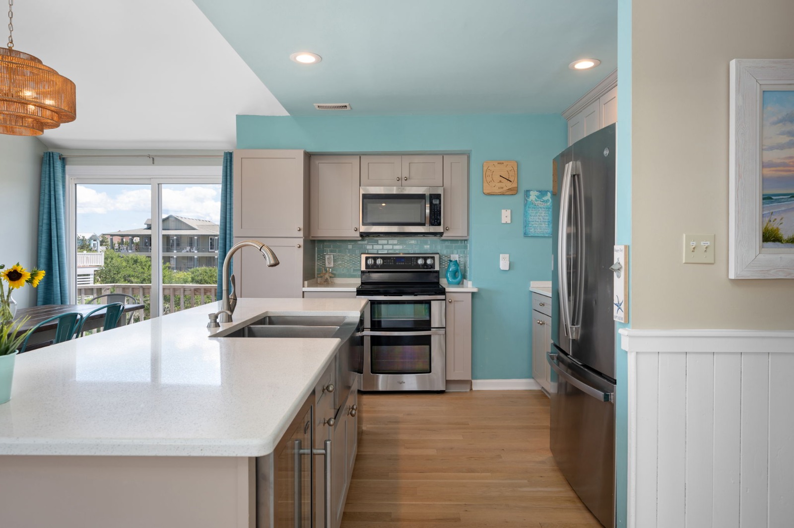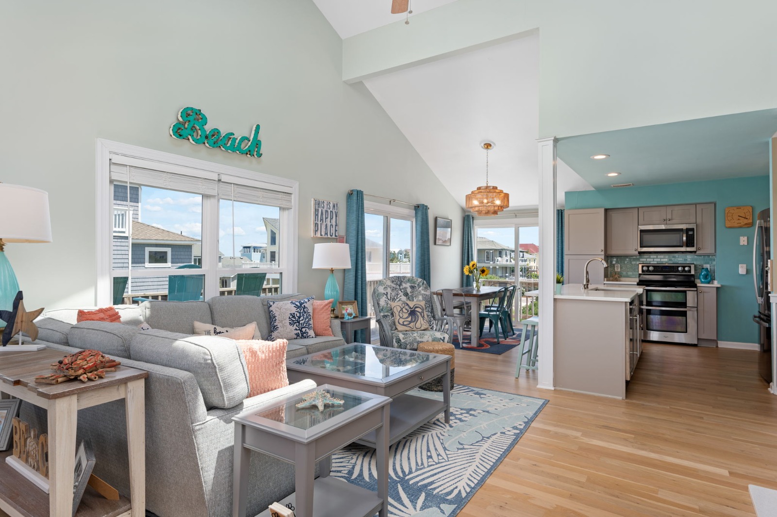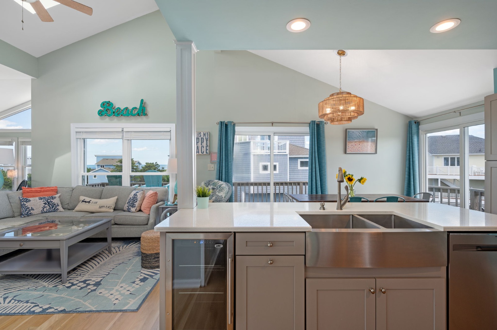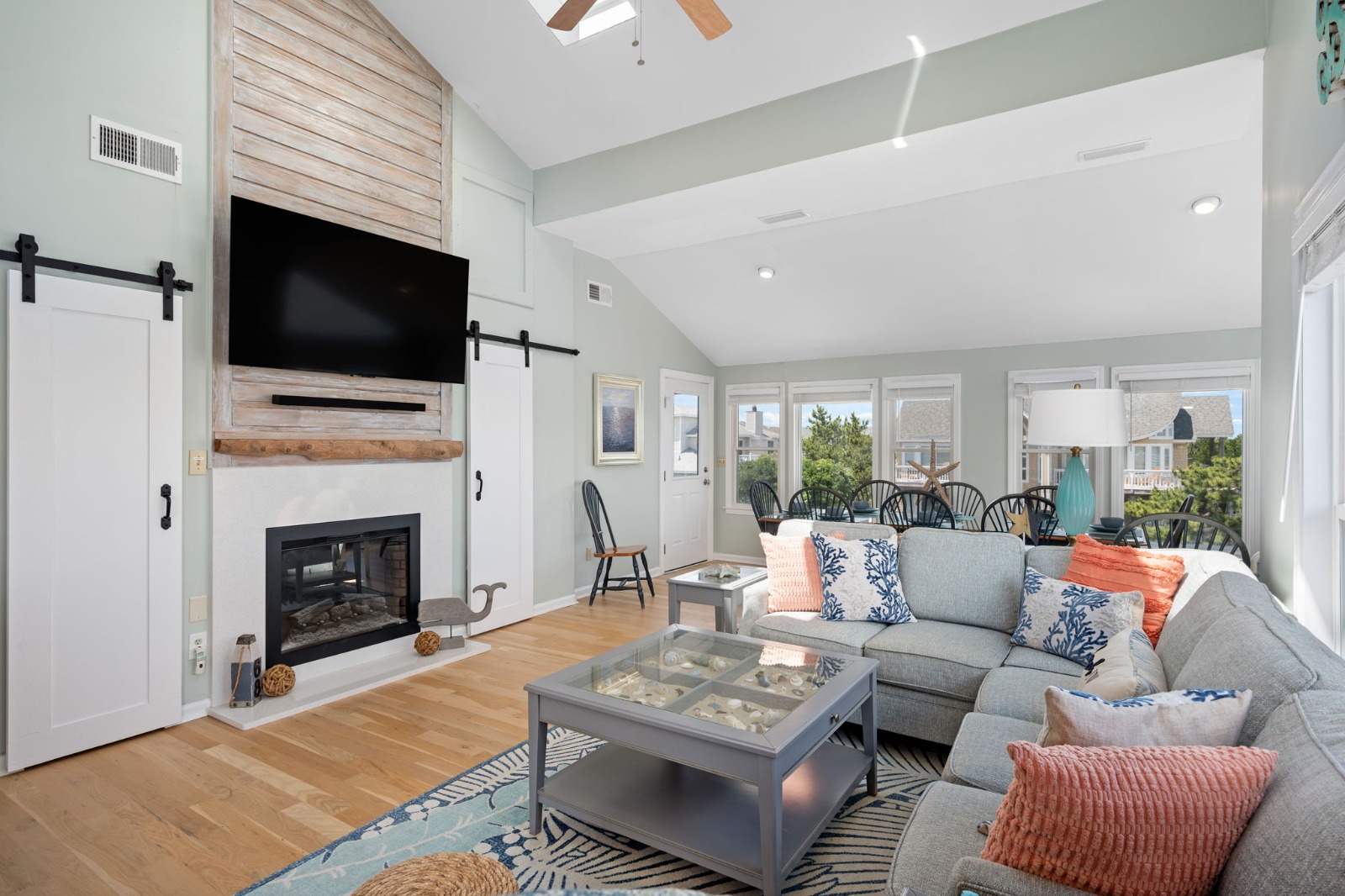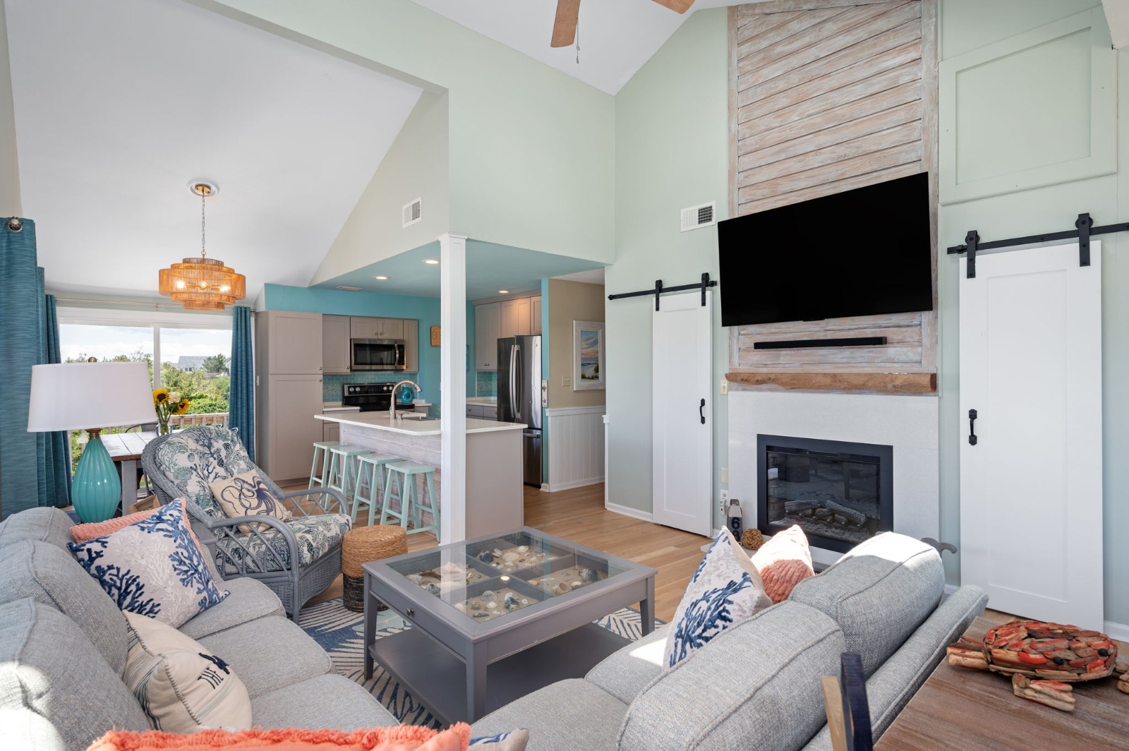 Top Level - Great room with open concept floor plan, vaulted ceilings, 65″ flat-screen HD Smart TV/Blu-Ray/DVD player, Bluetooth sound system, electric fireplace and access to several decks with ocean views. Updated kitchen with island, double oven and additional under-counter beverage refrigerator, breakfast bar seating for 4, breakfast nook seating for 6+, large dining area with ocean views and seating for 10, half bath, laundry area with washer and dryer and a King Master Bedroom with Smart HDTV, private full master bathroom, and deck access.