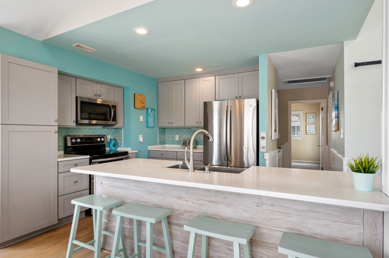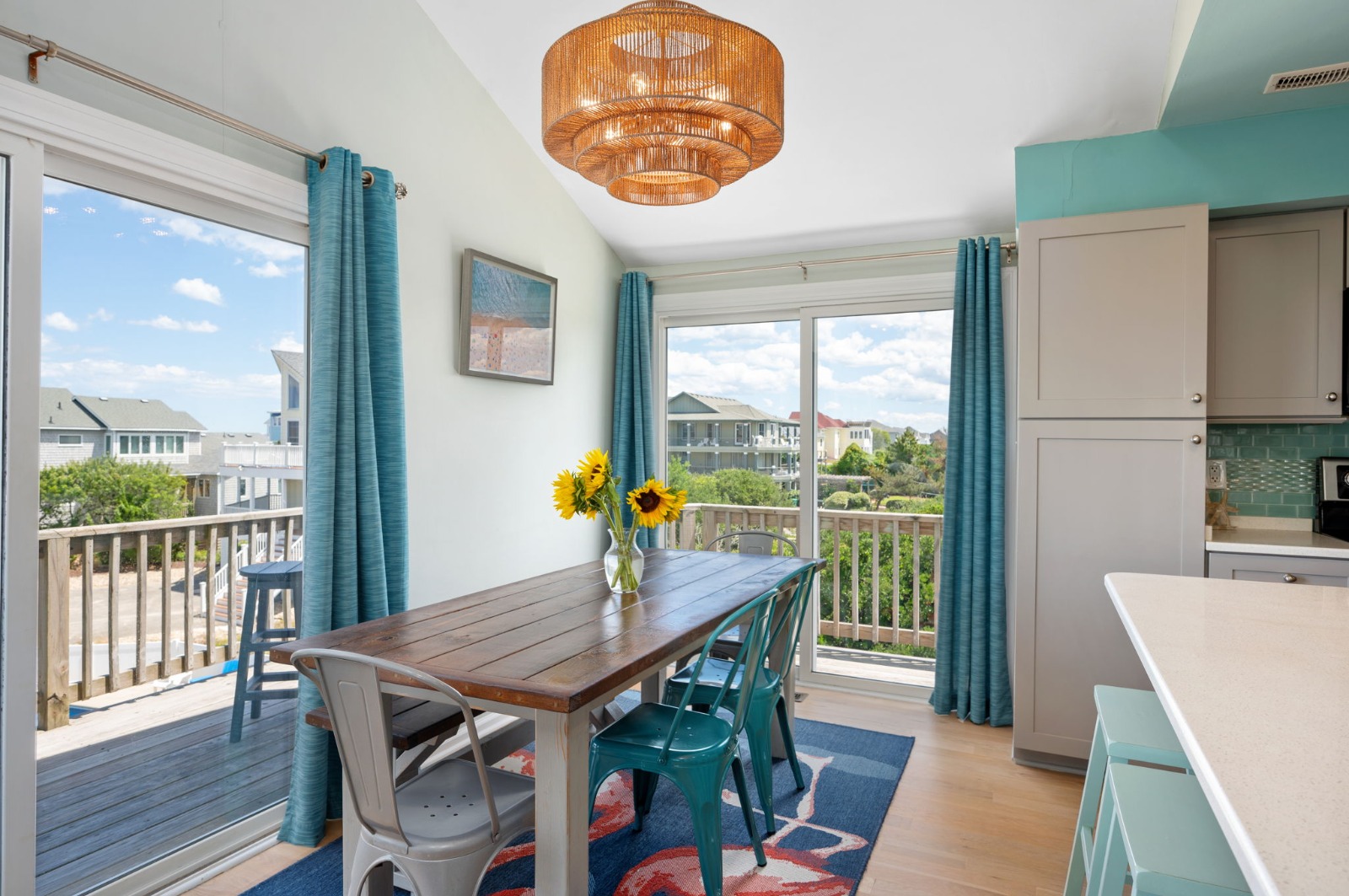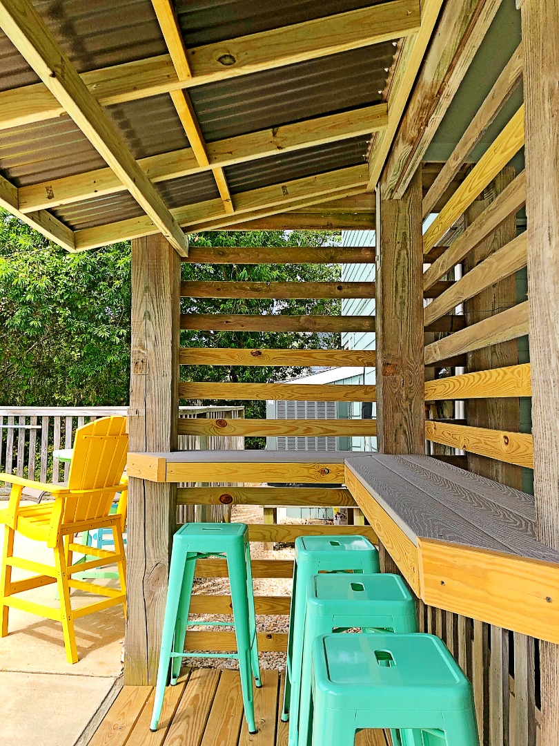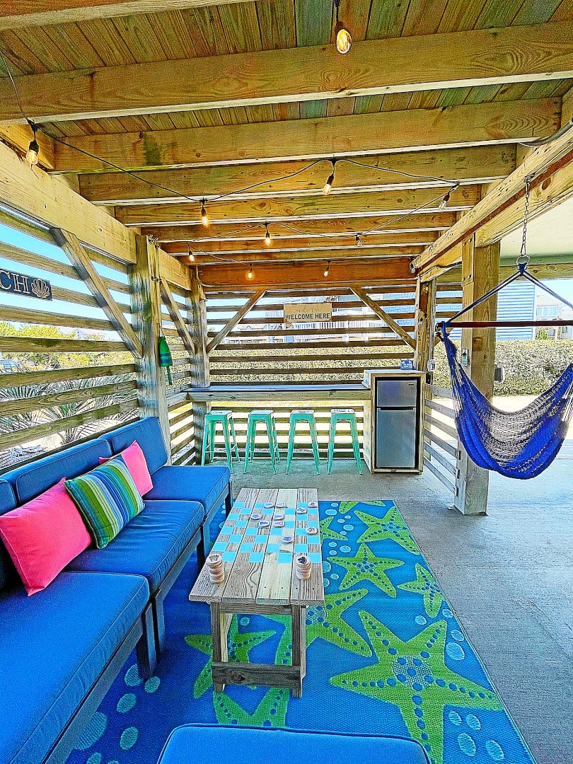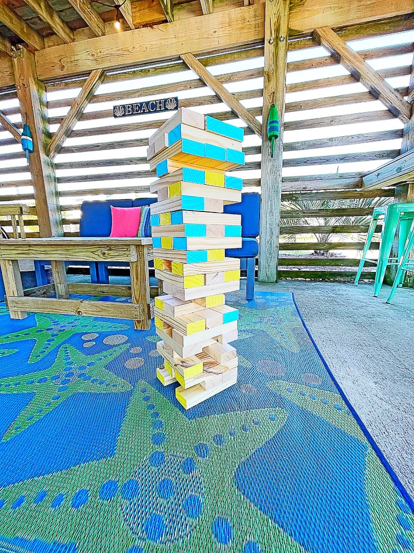 Happy Daze offers a sun-filled open-floor plan on the third level offering ocean views and vaulted ceilings in the great room, kitchen, and dining areas. This recently updated home has plenty of room to relax with your family and friends in the bright, beachy interior, or you can step outside to enjoy a refreshing dip in the private gated in-ground pool complete with a covered cabana area, tiki bar, and sun deck, take an invigorating outdoor shower, or unwind in the hot tub.
