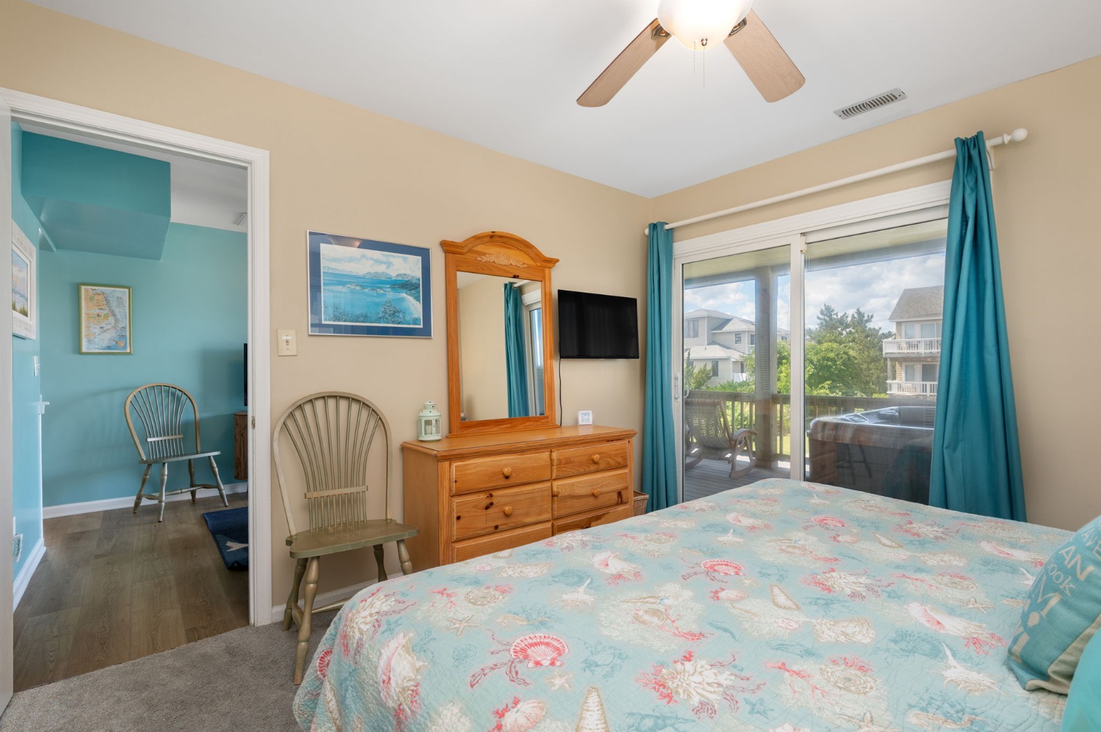 Mid Level - King Master Bedroom with flat-screen Smart HDTV, private full master bathroom with whirlpool tub and separate shower, plus deck access, Bedroom with a King Bed and flat-screen Smart HDTV and deck access, Bedroom with 2 Bunk Sets with access to a private deck, full hall bath and a den with flat-screen HDTV/Smart Blu-Ray/DVD player. This level includes two decks and the outdoor hot tub.