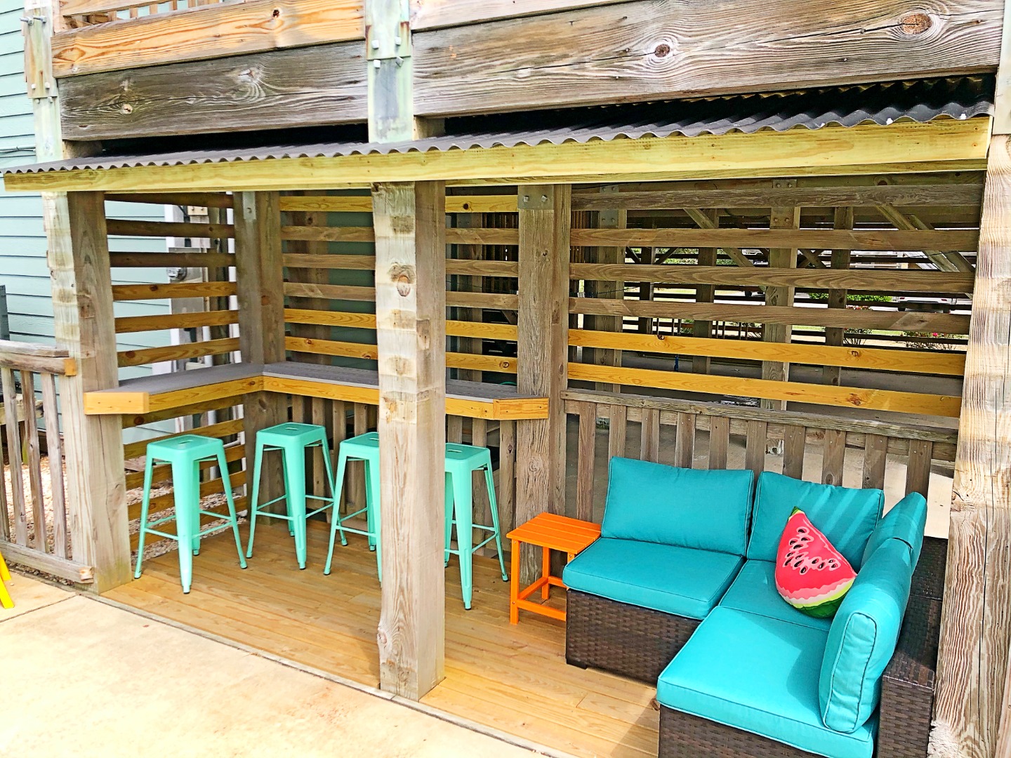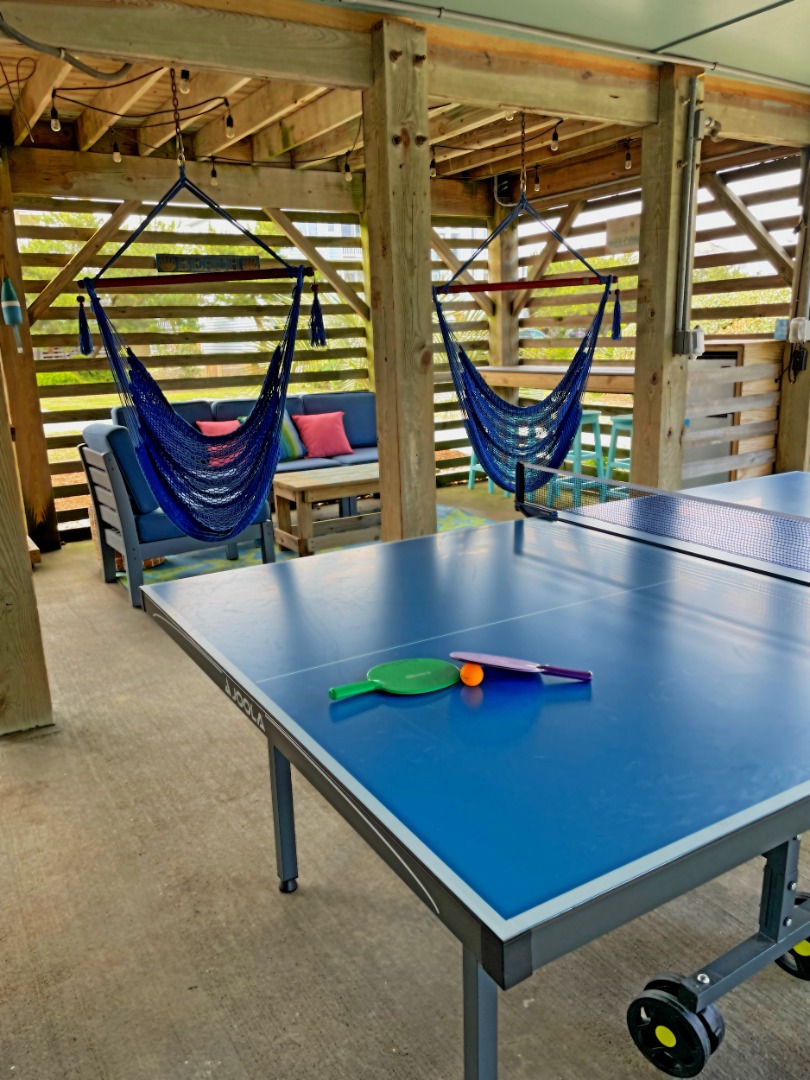 Ground Level - Exterior amenities include a gated-private pool with Covered Cabana and Tiki Bar; Covered Hangout area with second Bar, Fridge/Freezer, seating for 10+, outdoor Games, and Hammock Swings; outdoor shower and park style grill. Entry level. Twin Bedroom.