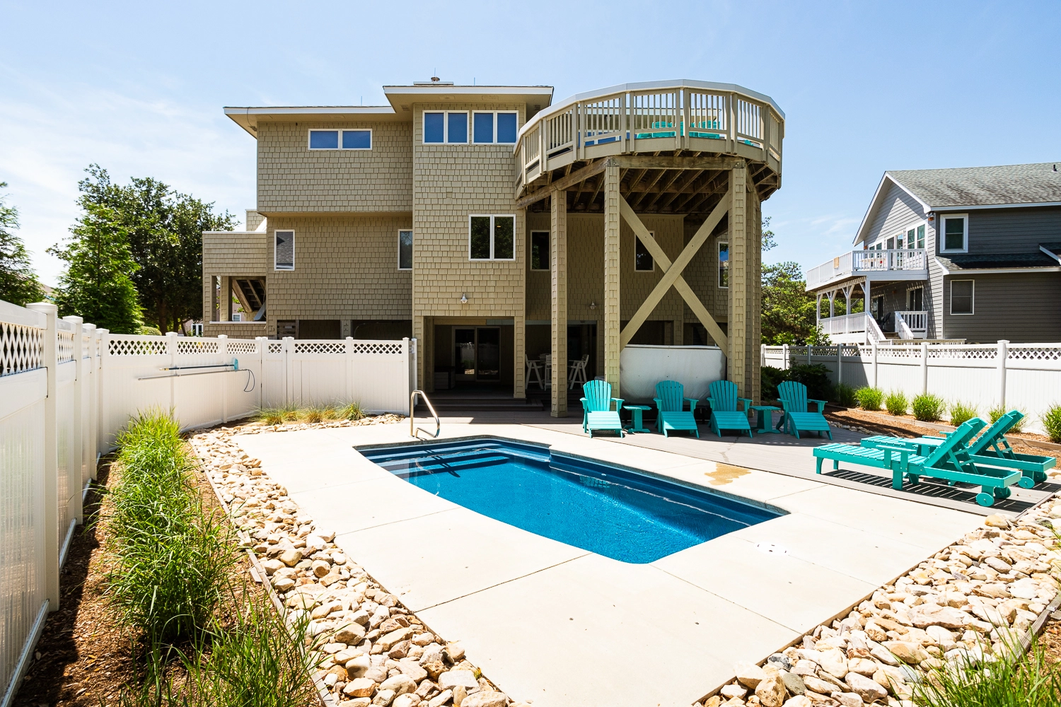 On the top floor of the home, kick back and relax with the entire family in the great room. Watch TV in the light and airy living area, which features a large, comfortable sofa. Sneak up the stairs with a good book for some quiet time during your day. The attractive kitchen is equipped with everything you need to prepare meals for the duration of your stay and features countertop seating, perfect for grabbing a quick breakfast before heading to the beach or pool. Enjoy meals together in the nearby dining area, or sit at the drink rail in tall chairs overlooking the pool and a great view of the Currituck Beach Lighthouse and spectacular sunsets. The sunroom is the perfect place to spend time catching up with loved ones. There is one master bedroom on the third level, with a private full bathroom that features a whirlpool tub. A half bathroom can also be found on the third floor.
