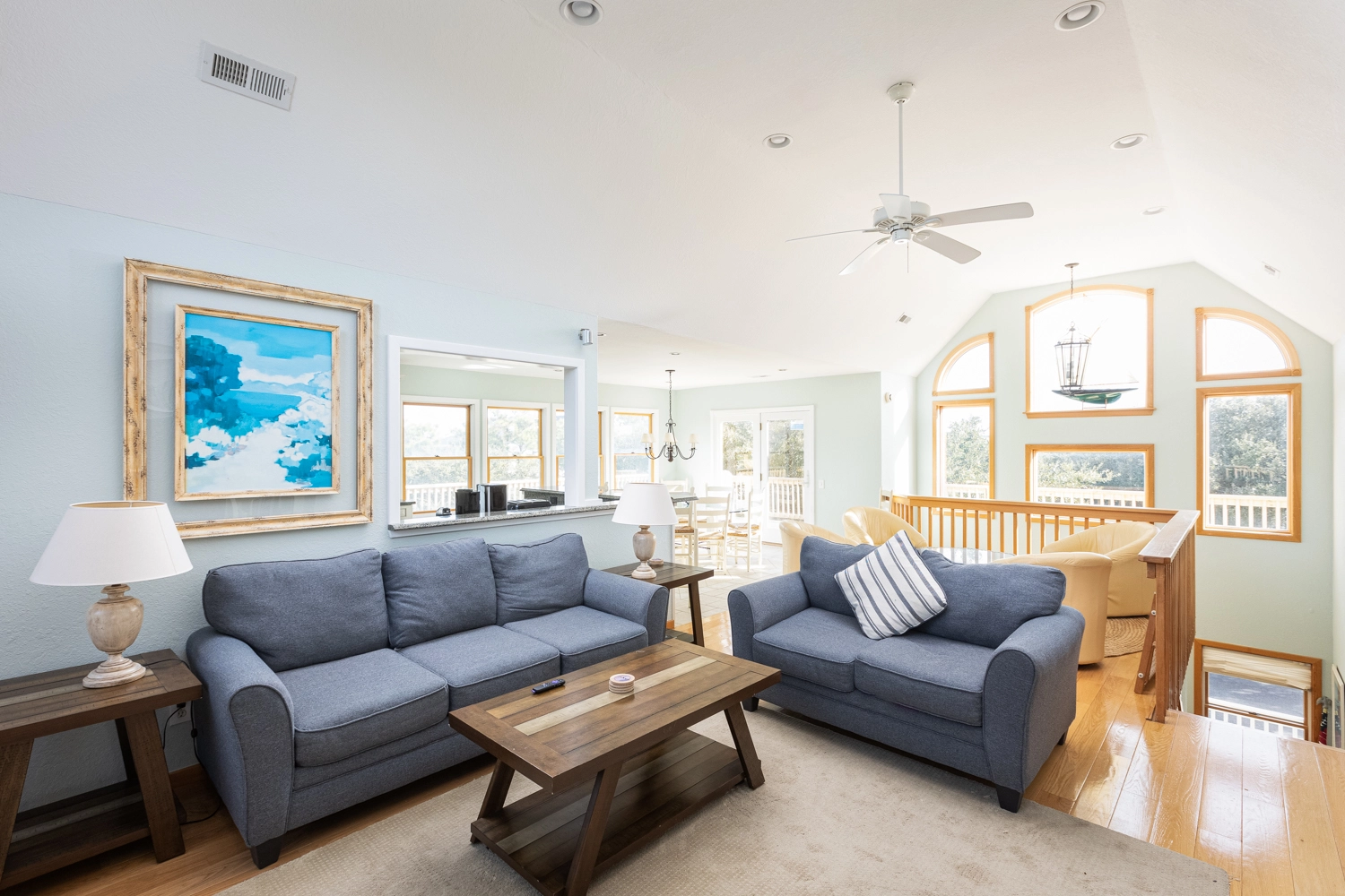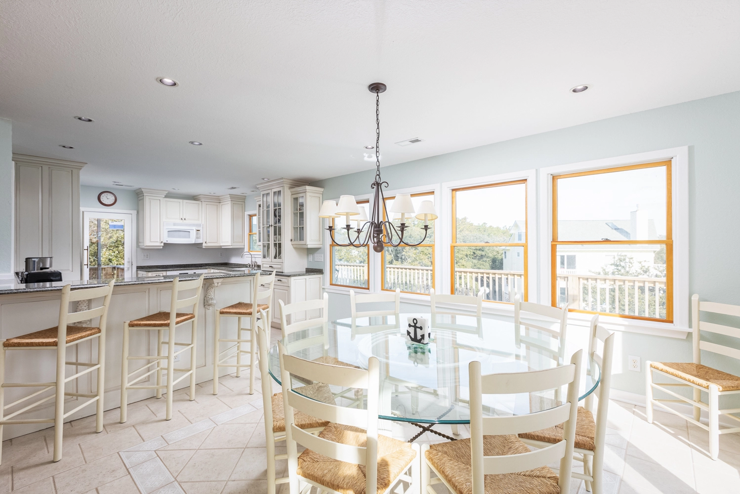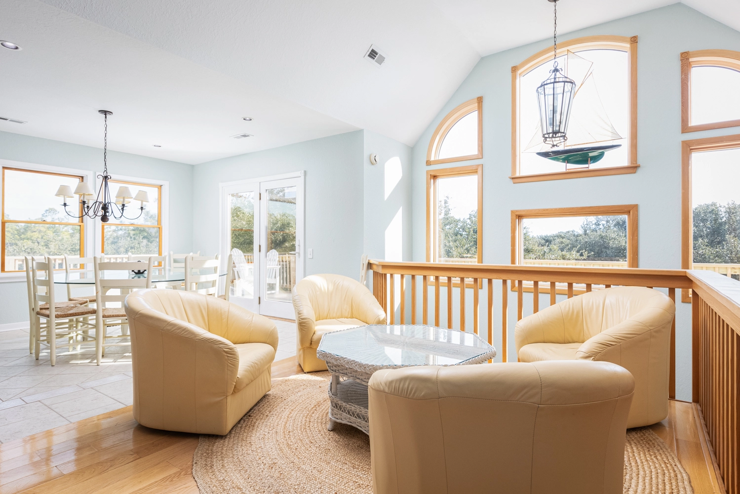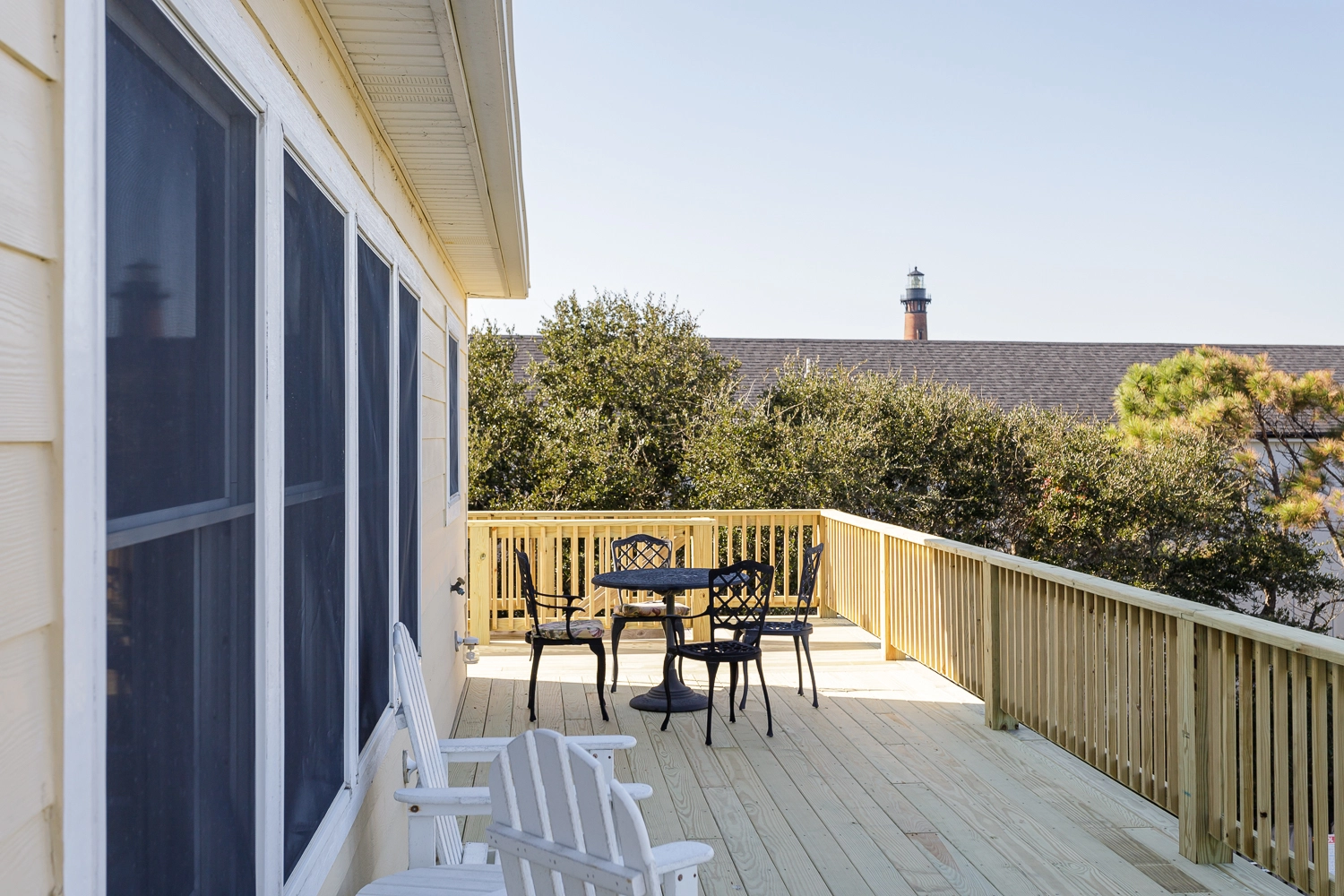 Bright, airy, and welcoming, the top level’s open floor plan features cathedral ceilings, abundant windows, and soft natural light. The spacious great room creates a perfect setting for conversation, movie nights, or quiet reading. A large dining area and well-equipped kitchen make meal preparation and shared dinners a pleasure. Step out onto the deck with morning coffee and enjoy a view of the iconic Currituck Beach Lighthouse, framed by Carolina blue skies.