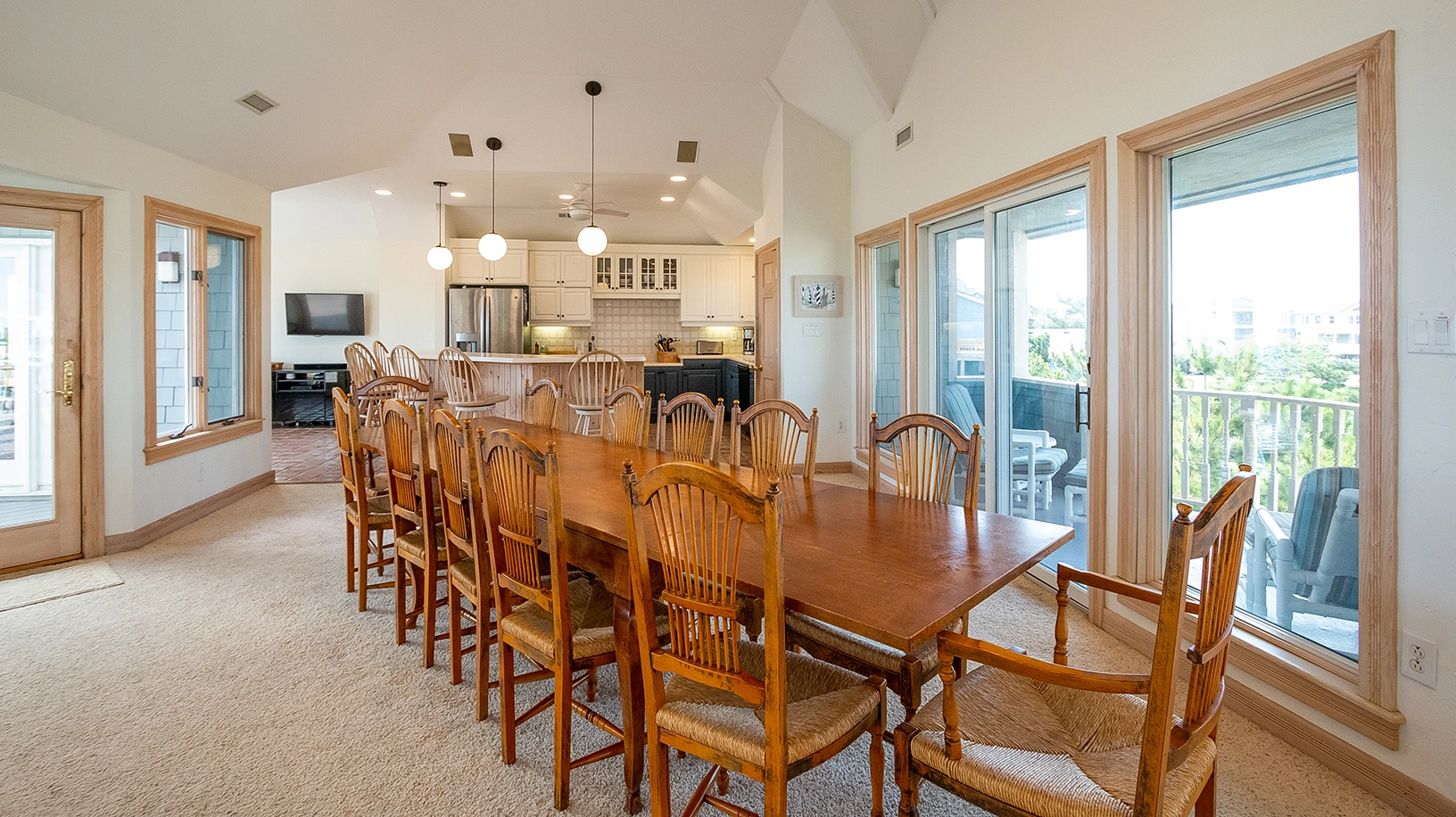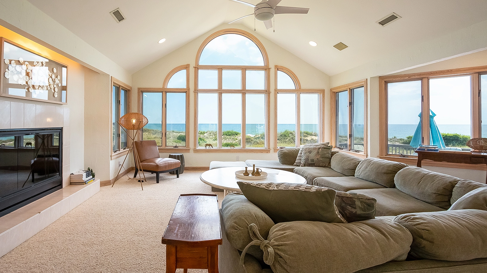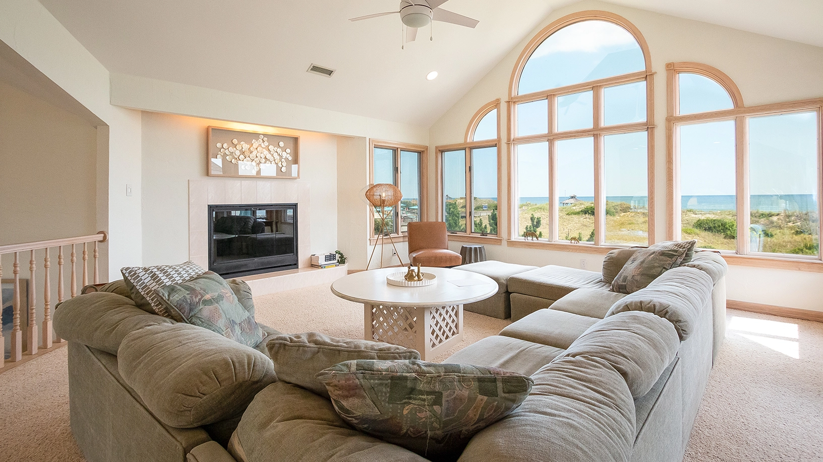 Inside, the top-level living space invites the whole family to gather with plenty of room to relax and reconnect. The fully stocked kitchen is a dream for home chefs, complete with everything needed to whip up meals for the whole group. Dine together around the large oceanview table, pull up a stool at the bar, or start your morning in the bright and breezy breakfast nook surrounded by windows framing the dunes and waves.