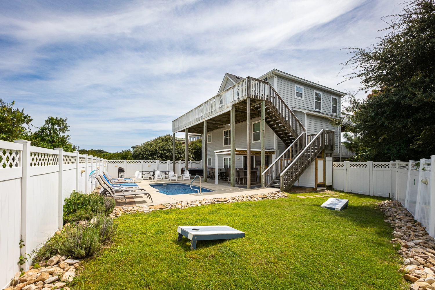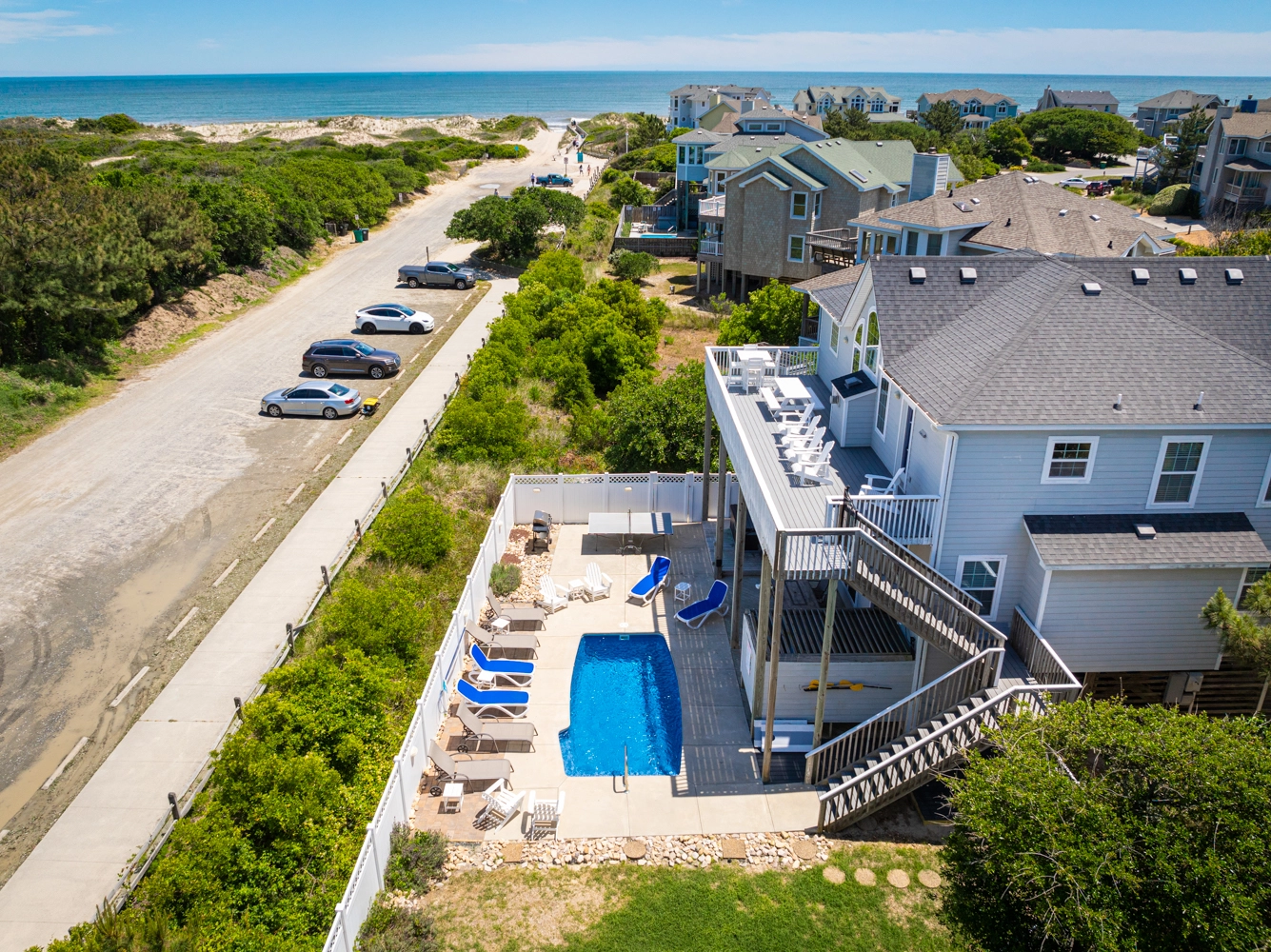 The middle level of the home includes an additional common space, a den, three bedrooms, and a full bathroom. One of the bedrooms is a master bedroom that includes a whirlpool bathtub in the bathroom. The ground level includes two master bedrooms, each with a private bathroom, a second refrigerator and laundry facilities. Step outside to splash in the private pool or relax in the hot tub. An outdoor table and chairs are conveniently located in the pool area along with a bar area and outdoor TV, allowing for lunch or dinner poolside or watching your favorite show. Corolla Light offers a plethora of community amenities, including multiple swimming pools, basketball courts, tennis courts, playground, indoor fitness center with pool, in-season trolley service, and more. No matter what vacation activities you choose, you’ll have a “Shell of a Time” in this vacation home!