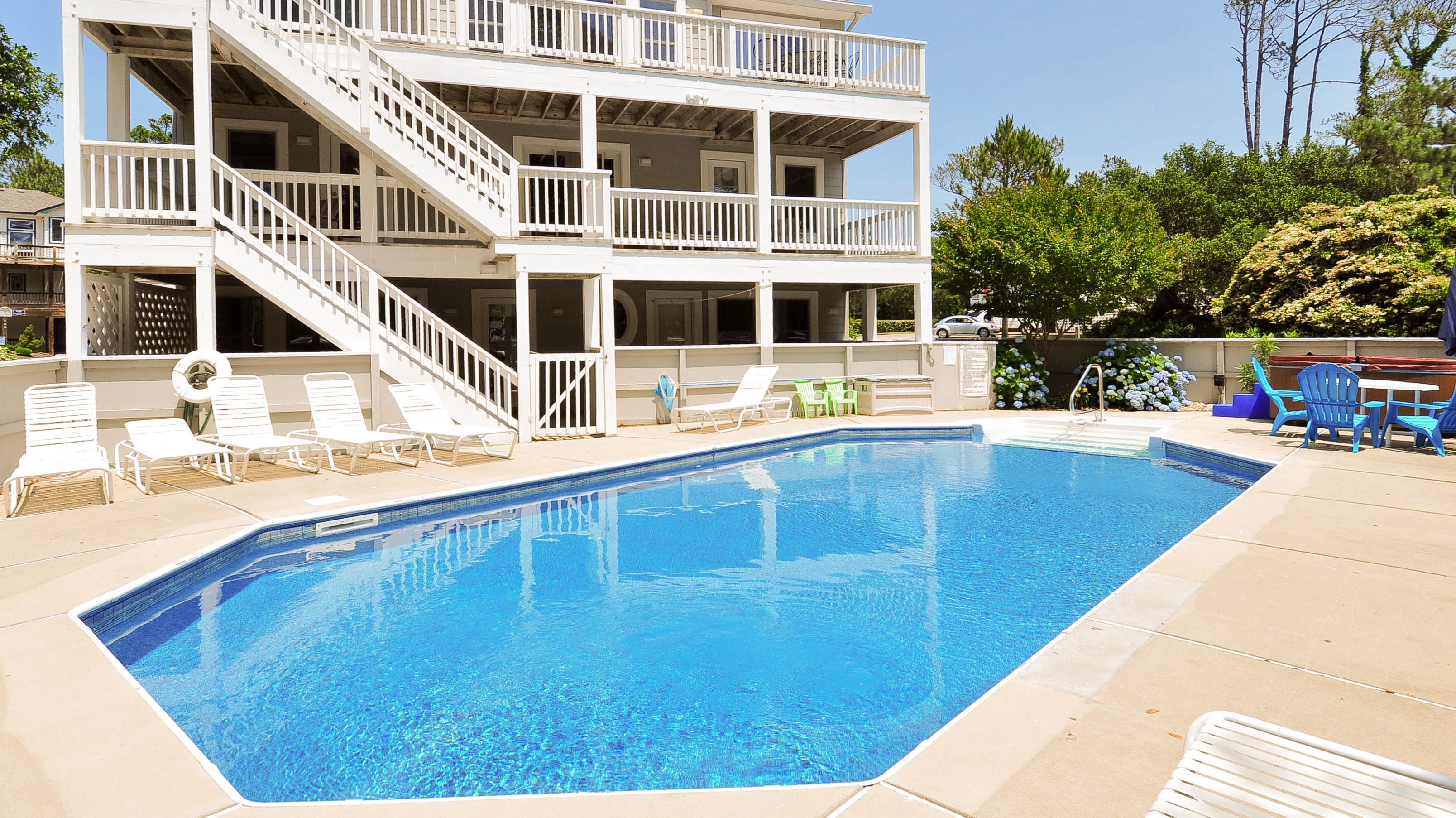During the day, lounge by the 16’x32’ private pool or splash around with the little ones. At night, unwind with a soak in the hot tub underneath the stars. The multiple decks are ideal for watching the evening sunsets over the Currituck Sound or the perfect place to sip your morning cup of coffee. If you prefer to go for a relaxing walk, this home offers easy access to nature trails and the chance to see wildlife.