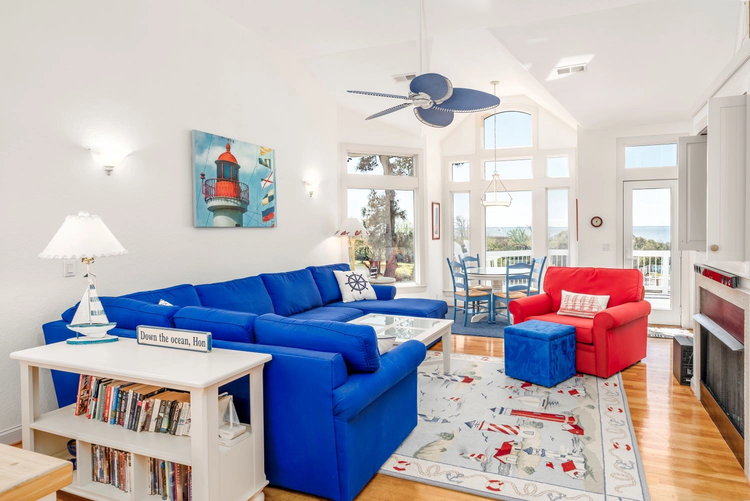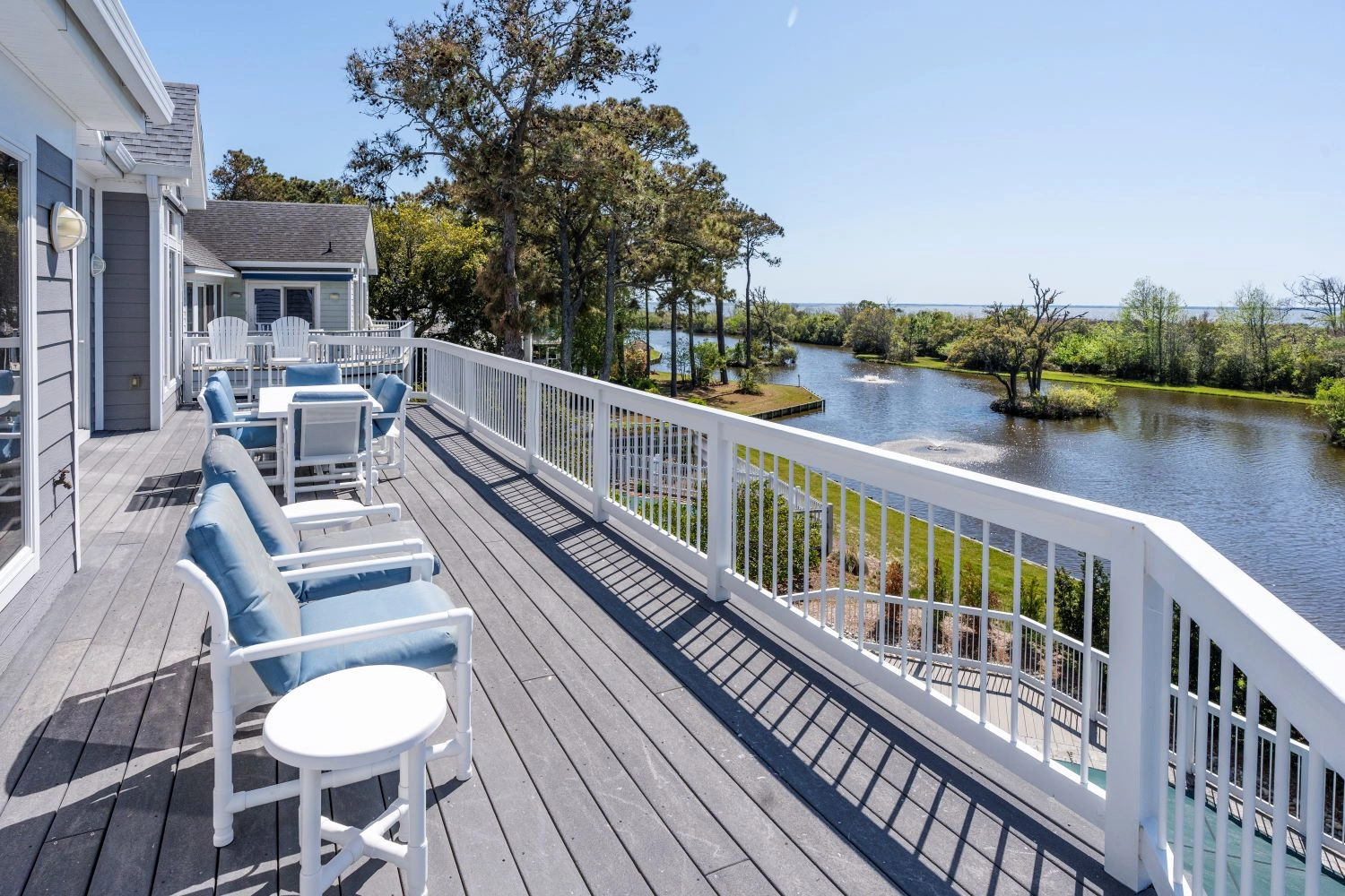 The home’s main gathering place is the great room on the third floor, which features large windows to allow the beautiful sound view to fill the space. Kick back and relax in the comfortably furnished living area, which features cheery nautical decor throughout. Prepare meals throughout your stay with ease in the fully equipped kitchen. Getting groceries from the ground floor up to the kitchen is made easier using the elevator. Savor meals together as a family in the dining area, or dine outside on the deck that overlooks the fishing pond and the sound. The spacious deck features comfortable seating and is a great place to hang out and enjoy the view at any time of the day. Back inside, there is one master bedroom on the top floor, which includes access to the deck as well as a private bathroom with a whirlpool tub. A half bathroom completes the third floor.