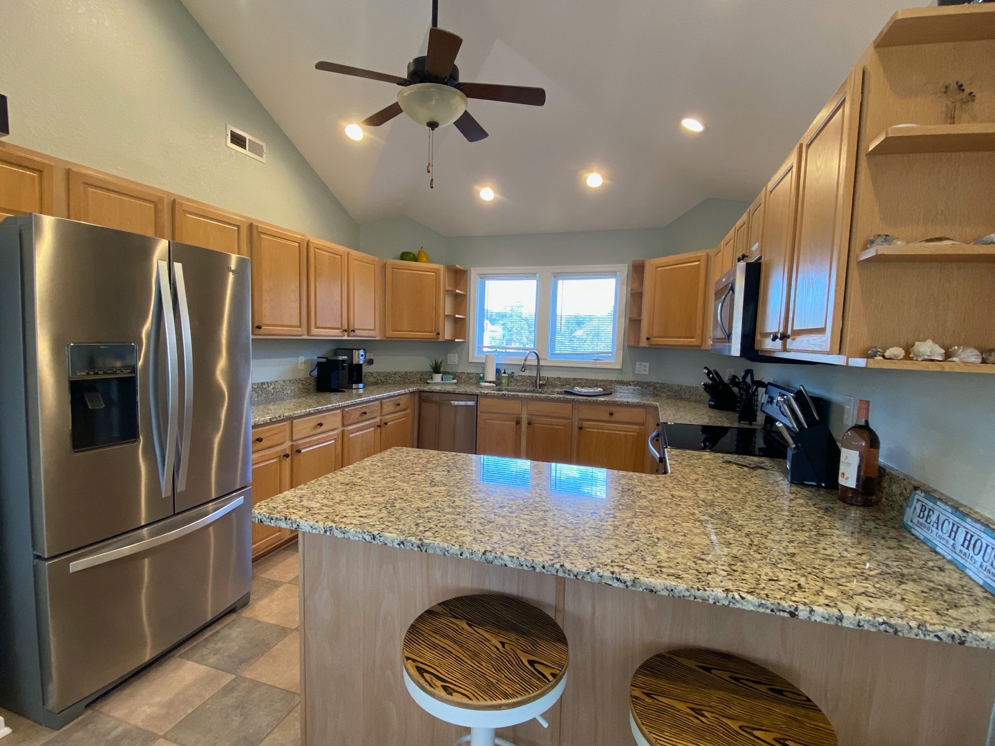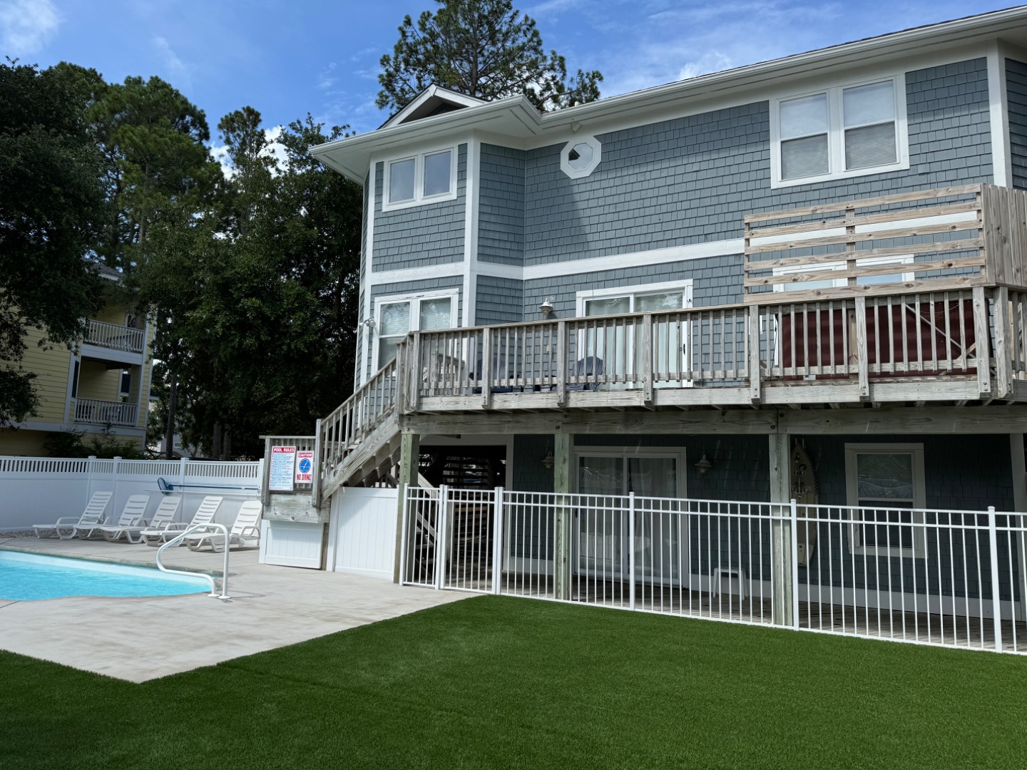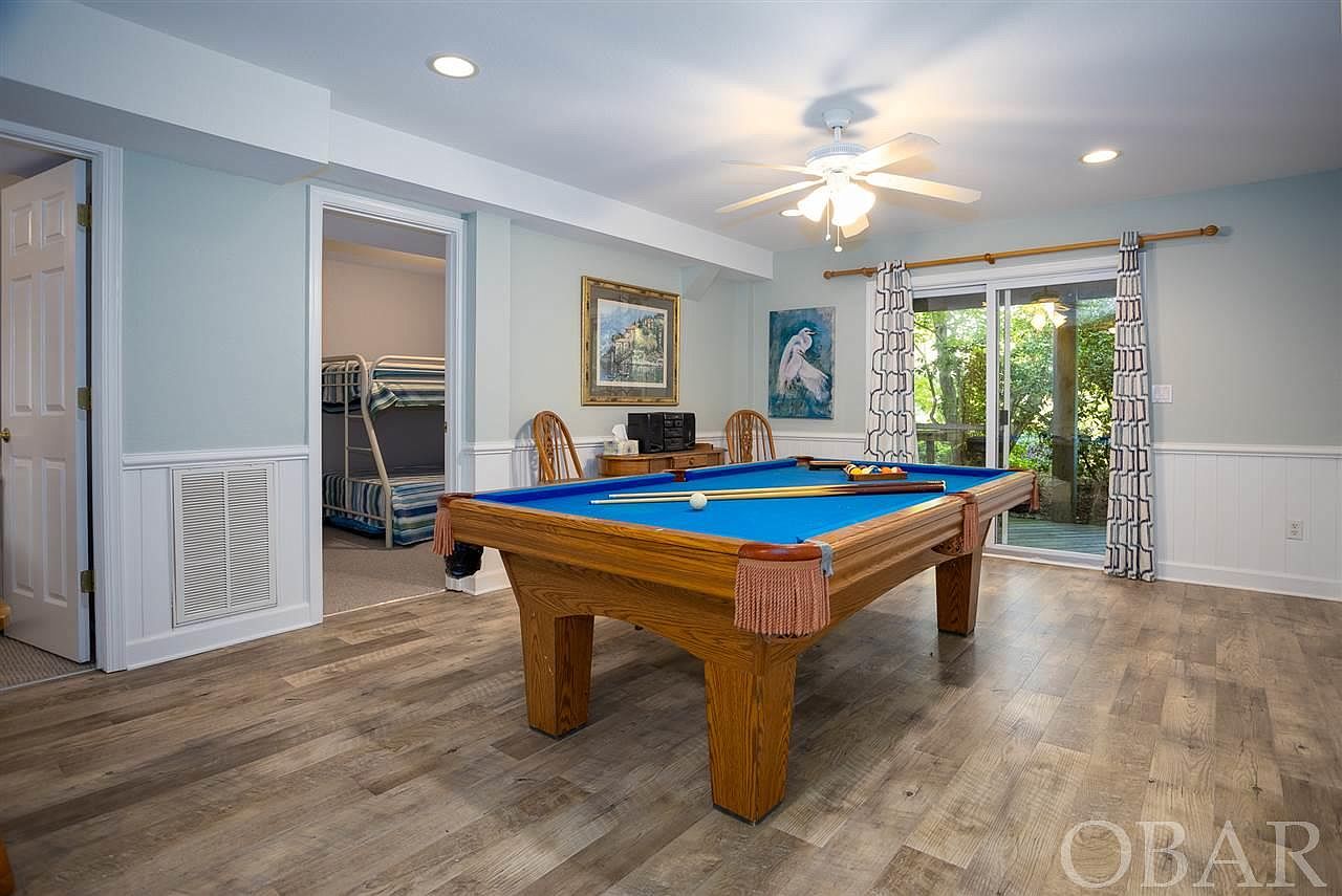 The ground level offers a bunk room (twin over full) , a queen bedroom, a full bath and a rec room with a pool table. The rec room accesses the rear patio which leads to the private swimming pool.