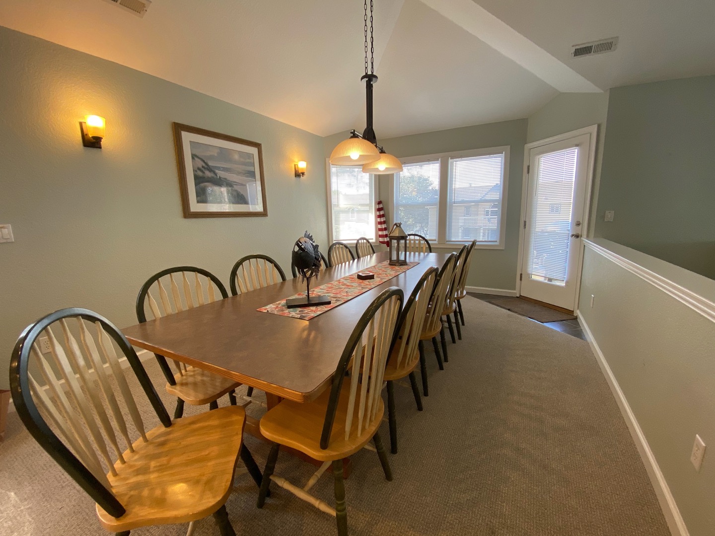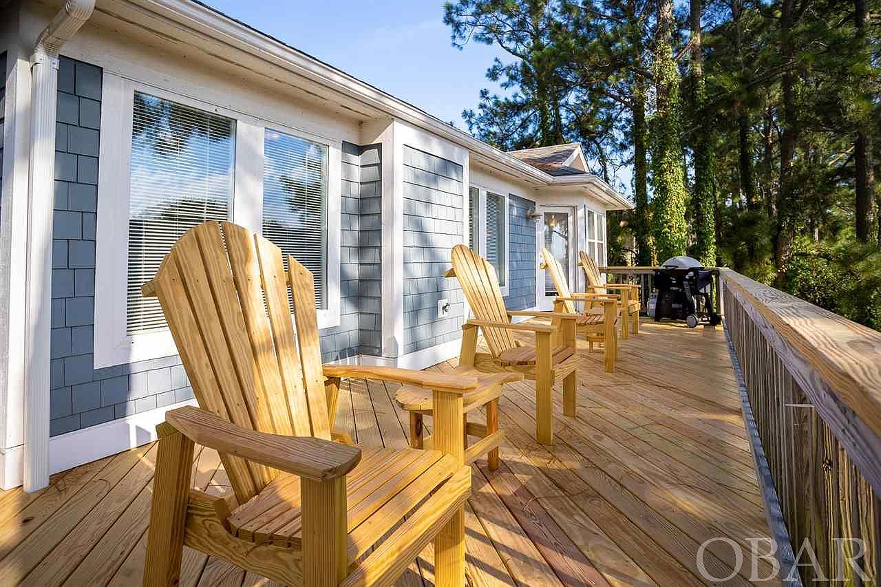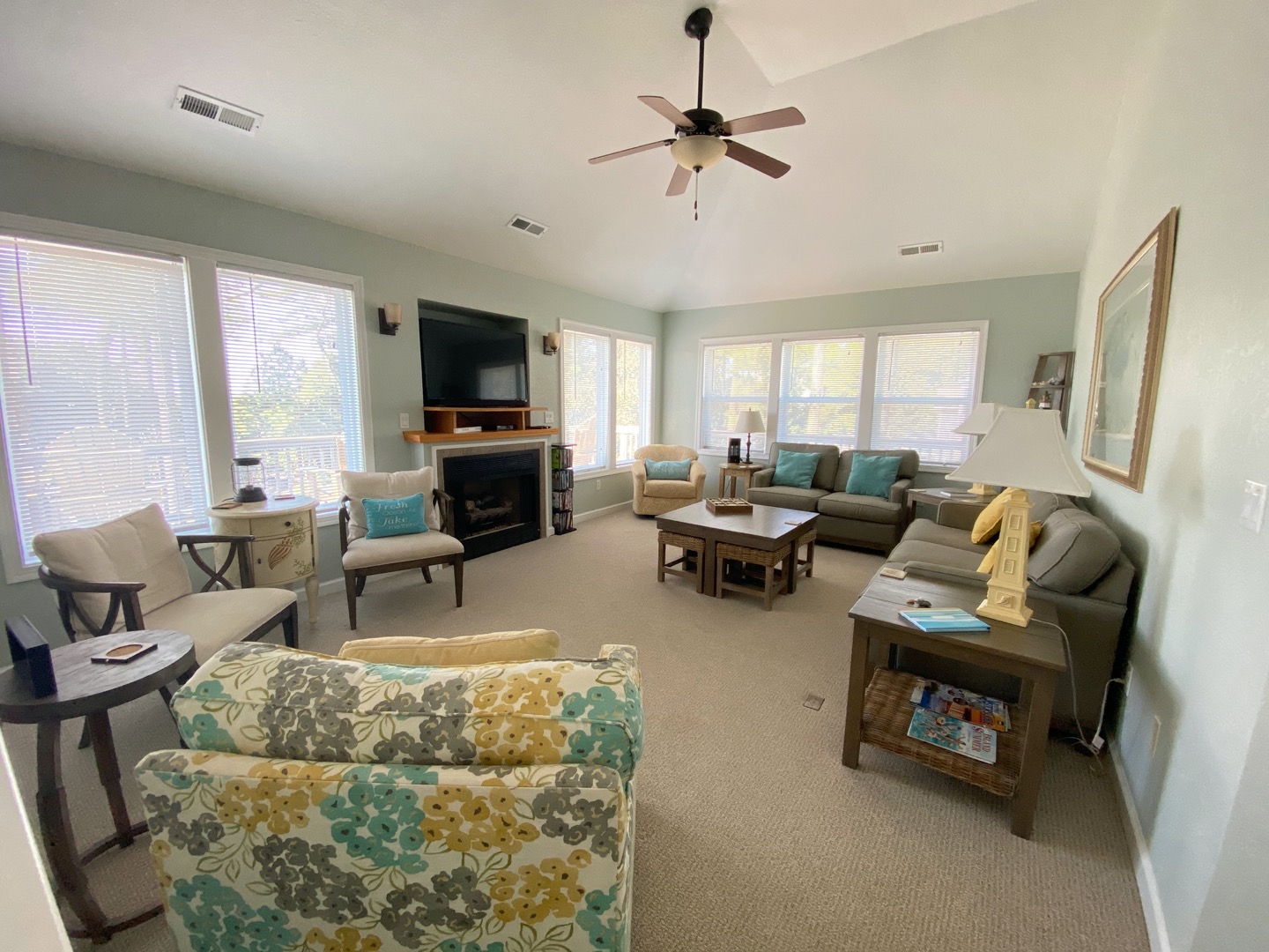 Sounds Good to Me hosts a reverse floor plan highlighting sound views from the living and dining areas and kitchen on the top floor. Our well stocked kitchen is open to the dining room and family room. Seating for 12 allows your family to enjoy dining together. The top level also has a spacious king master suite and beautiful decks to enjoy the sound breezes and sunset over the Currituck Sound.