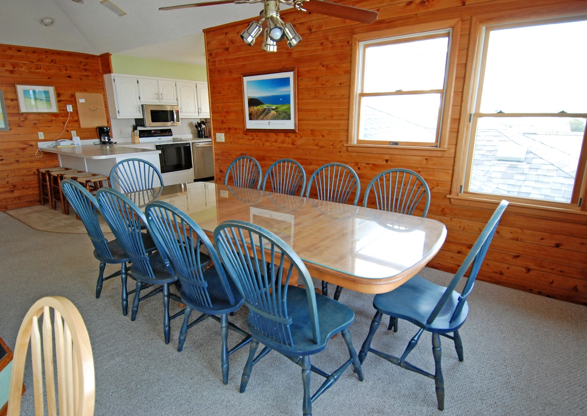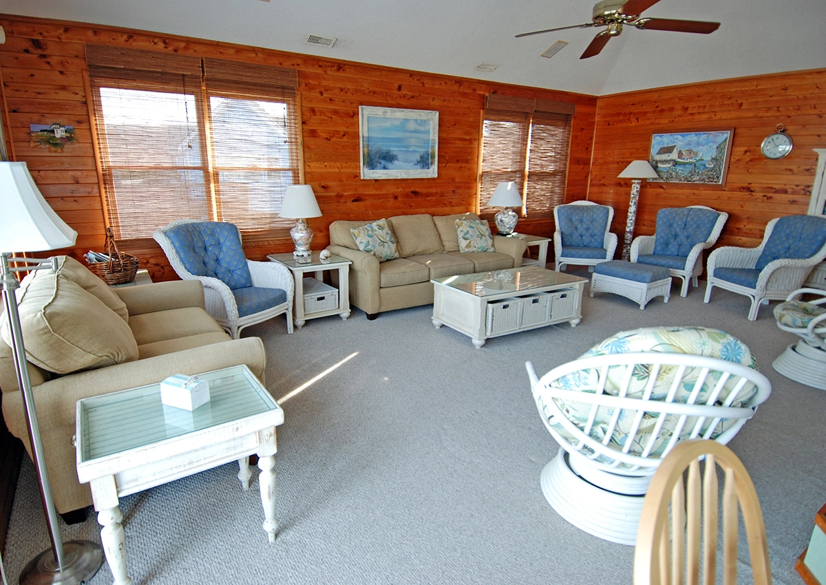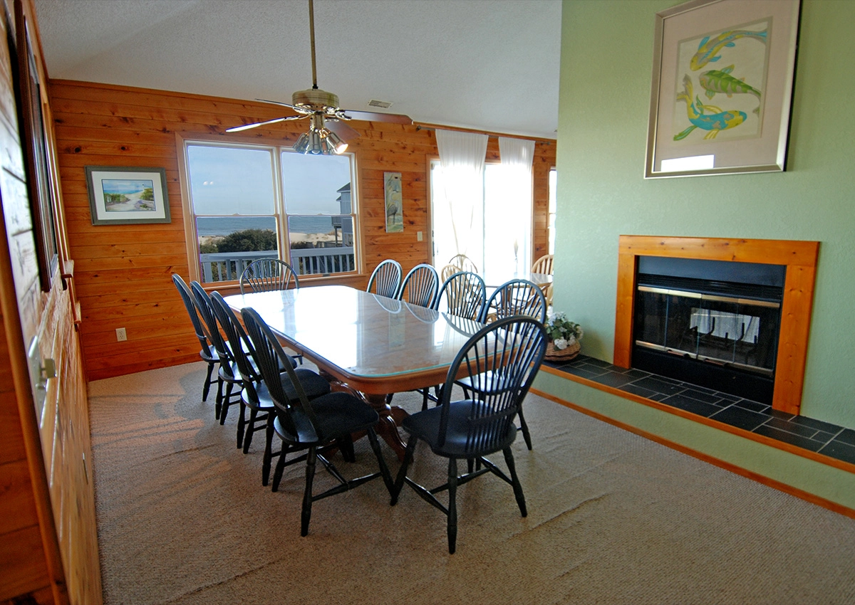 Gather the family for some classic Outer Banks fun at “Southern Star!” This semi-oceanfront vacation home is just one home back from the beach and offers stunning views of the ocean. With spacious rooms and classic beach house decor, this home is sure to be the perfect landing place between visits to the beach. The top level of the home features a unique great room, with a two-sided fireplace that divides the living and dining areas. In addition to the dining area with fireplace, there are additional places to sit and eat, with kitchen countertop seating and a comfy seating area off of the kitchen. Step outside to a spacious deck with additional seating to enjoy the outdoors. A half bathroom is located on the top level for convenience.