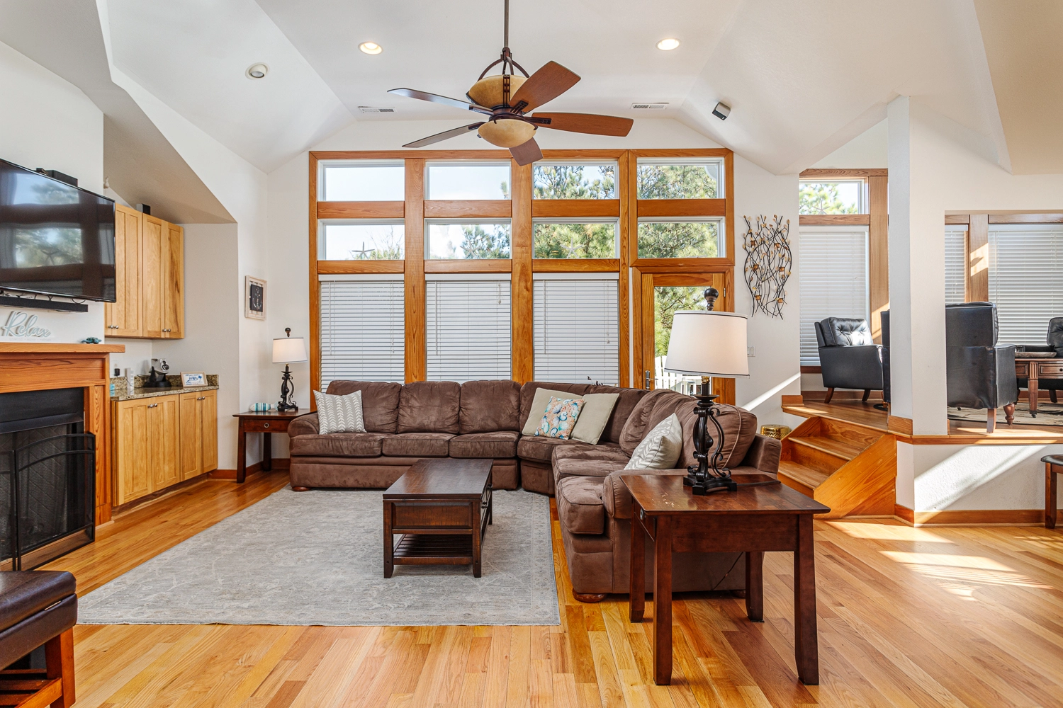The den on the middle floor serves as an additional living area, equipped with a TV and a beverage refrigerator. Many fun evenings will be had around the pool table in the rec room. There’s no need to run upstairs for a drink refill, as there is a wet bar with a refrigerator conveniently located in the rec room.