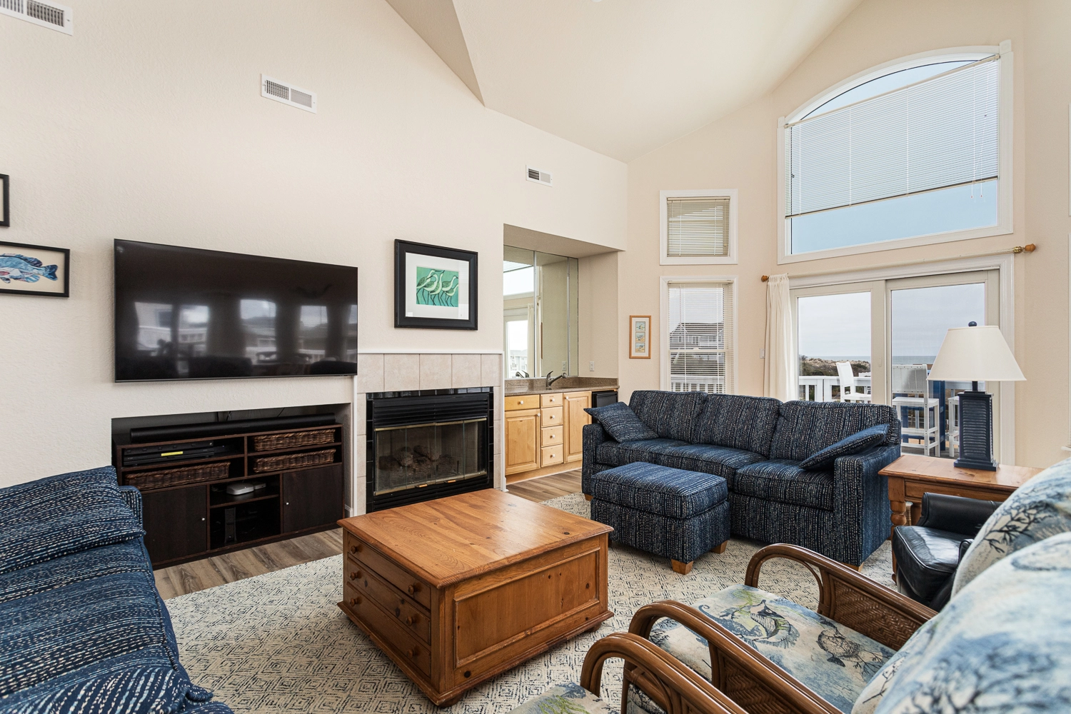 The top level welcomes you with an open-concept living area, where ocean views create a beautiful backdrop for gathering with family. The well-equipped kitchen, complete with modern appliances and ample counter space, invites culinary creativity, while the adjacent dining area ensures memorable meals with loved ones. A cozy living area featuring comfortable seating and entertainment options serves as the perfect spot for evening relaxation. There is a wet bar for refreshments with an icemaker. The nearby loft is a great place to curl up with a good book.